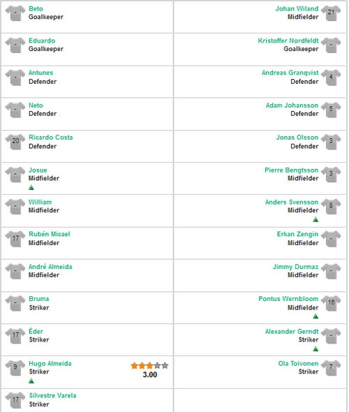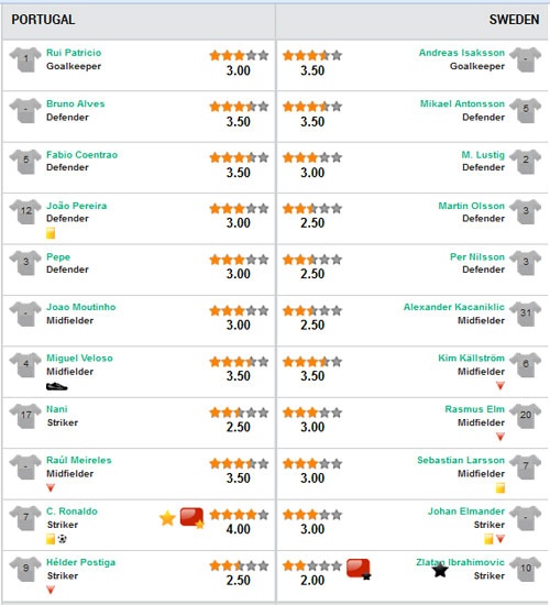 Điểm của các cầu thủ trận Bồ Đào Nha – Thụy Điển (theo Goal)