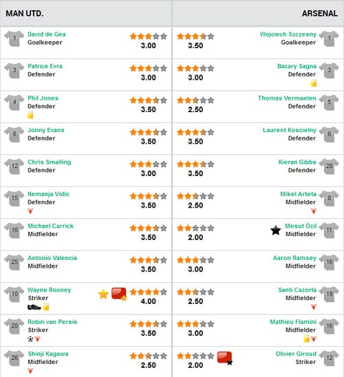 Sau khi trận đấu khép lại, trang Goal đánh giá tiền vệ khoác áo số 11 là cầu thủ thi đấu thất vọng nhất trong đội hình Arsenal. Ở trận này, Mesut Oezil chỉ được chấm điểm 2, bằng1/2 điểm của Wayne Rooney, cầu thủ được đánh giá xuất sắc nhất ở trận đại chiến MU – Arsenal trên sân Old Trafford. Không chỉ thực hiện pha đá phạt góc dẫn đến bàn thắng của MU, Ro10 còn tạo ra sự ảnh hưởng tích cực đến lối chơi của Quỷ đỏ.