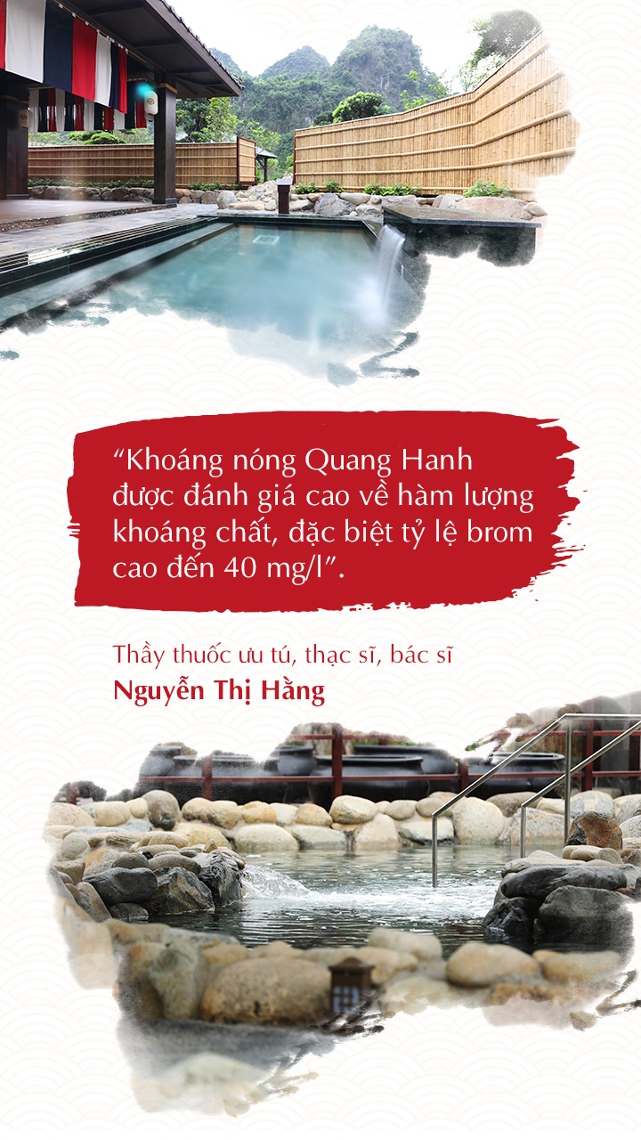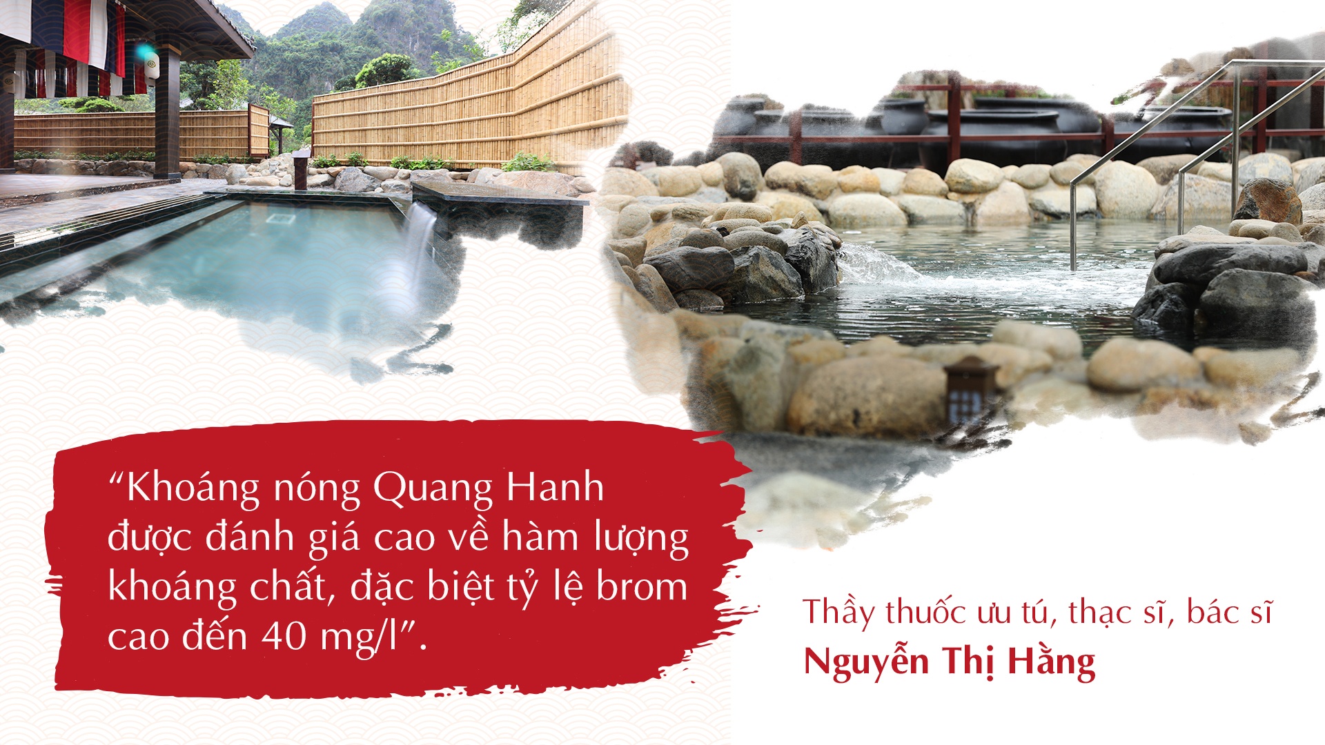 Mỗi địa phương có nguồn khoáng với đặc điểm khác nhau, trong đó, tại miền Bắc, khoáng nóng Quang Hanh được đánh giá cao về hàm hượng khoáng chất. Cụ thể, tôi được biết mẫu khoáng nóng tại đây đã được gửi sang Tokyo phân tích và được đánh giá cao với tỷ lệ muối, ion khoáng chất như natri, cali, kẽm và đặc biệt là brom có hàm lượng cao đến 40 mg/l. Có thể nói, đối với các mỏ khoáng nóng tại Việt Nam, lượng brom của Quang Hanh đạt tỷ lệ cao nhất.