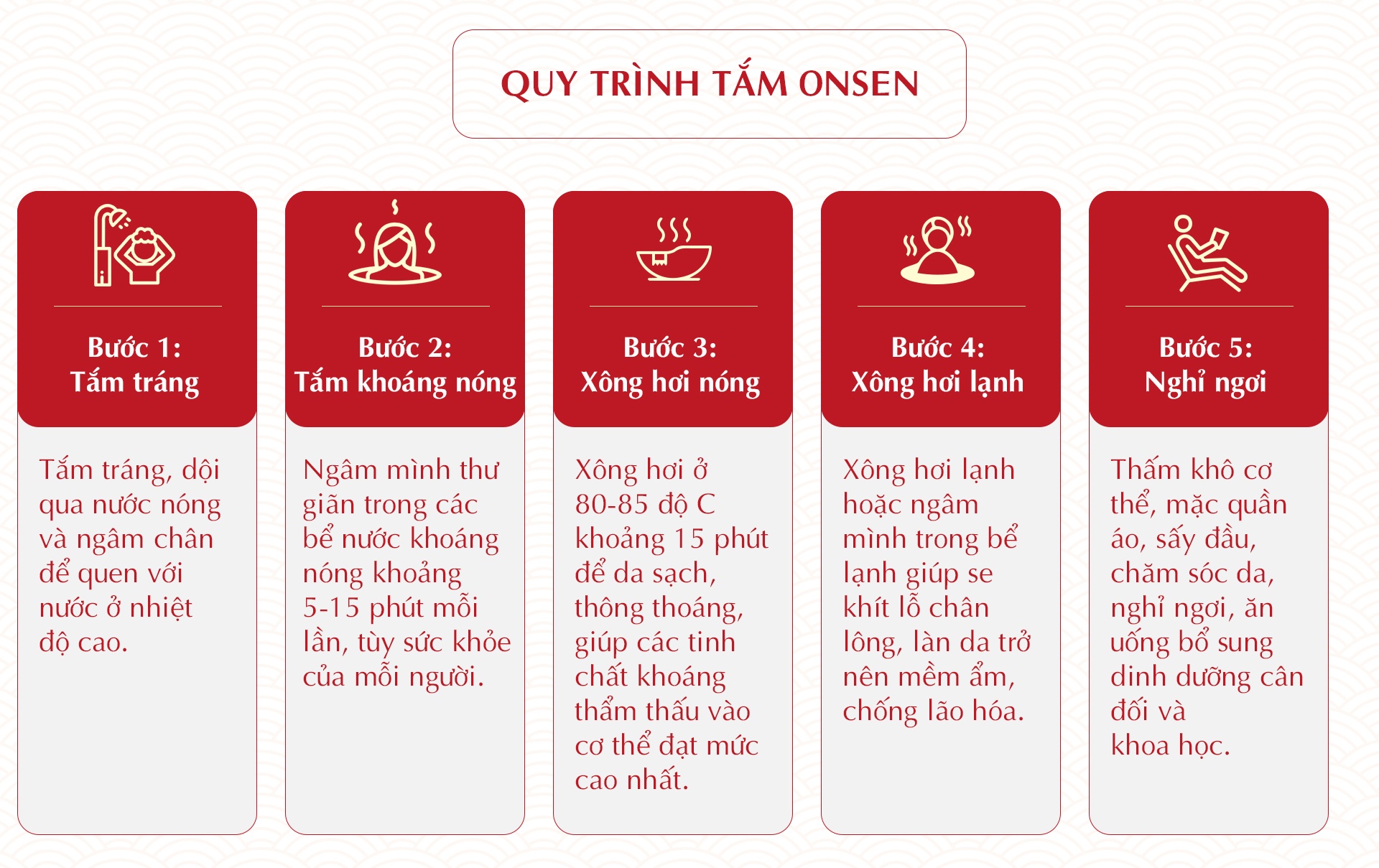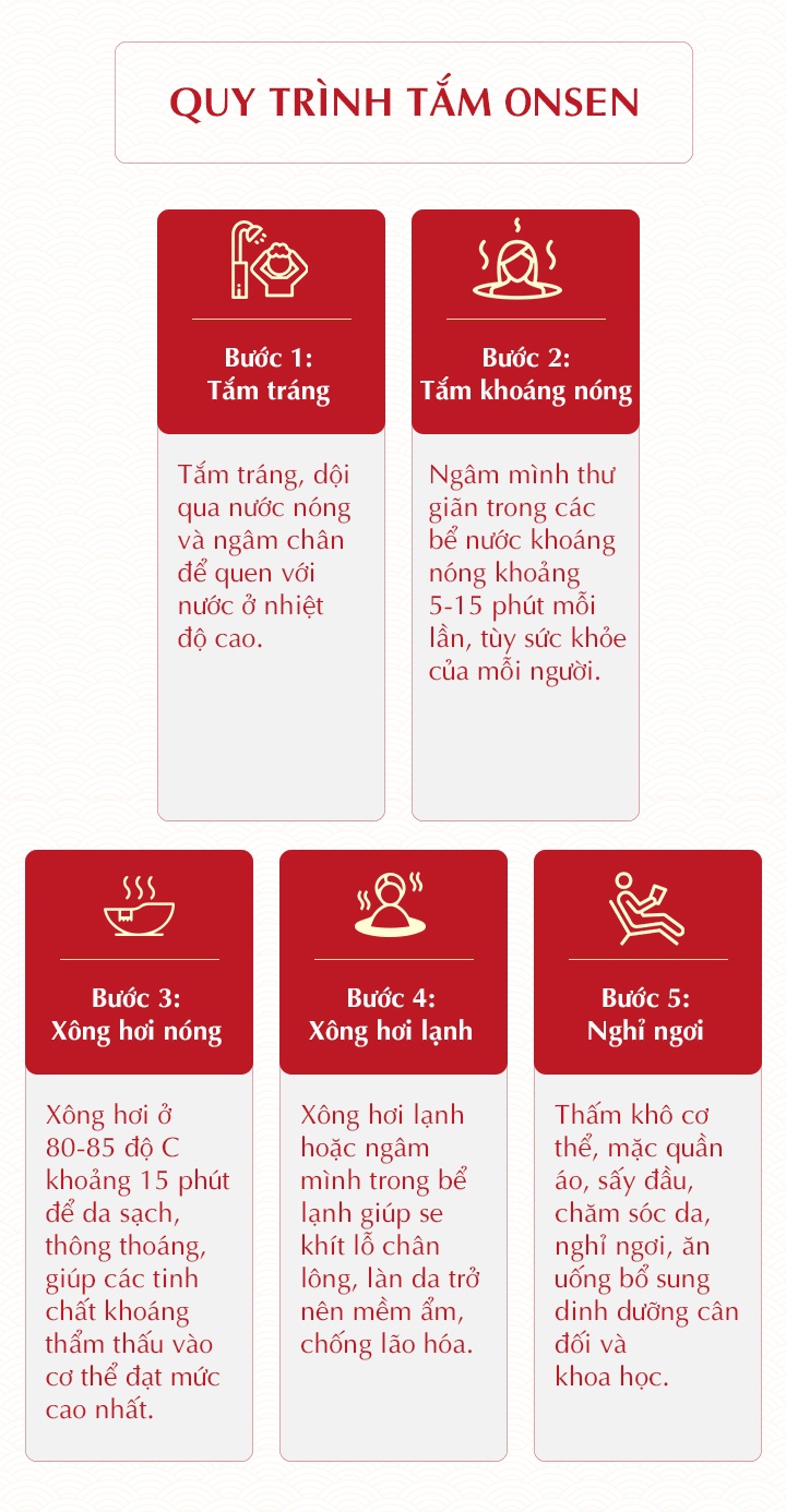 Chưa kể, việc tắm onsen tuân thủ quy trình rất nghiêm ngặt và khoa học, giúp cơ thể hấp thụ tốt nhất hàm lượng khoáng chất, từ đó đạt hiệu quả chăm sóc sức khỏe cao.