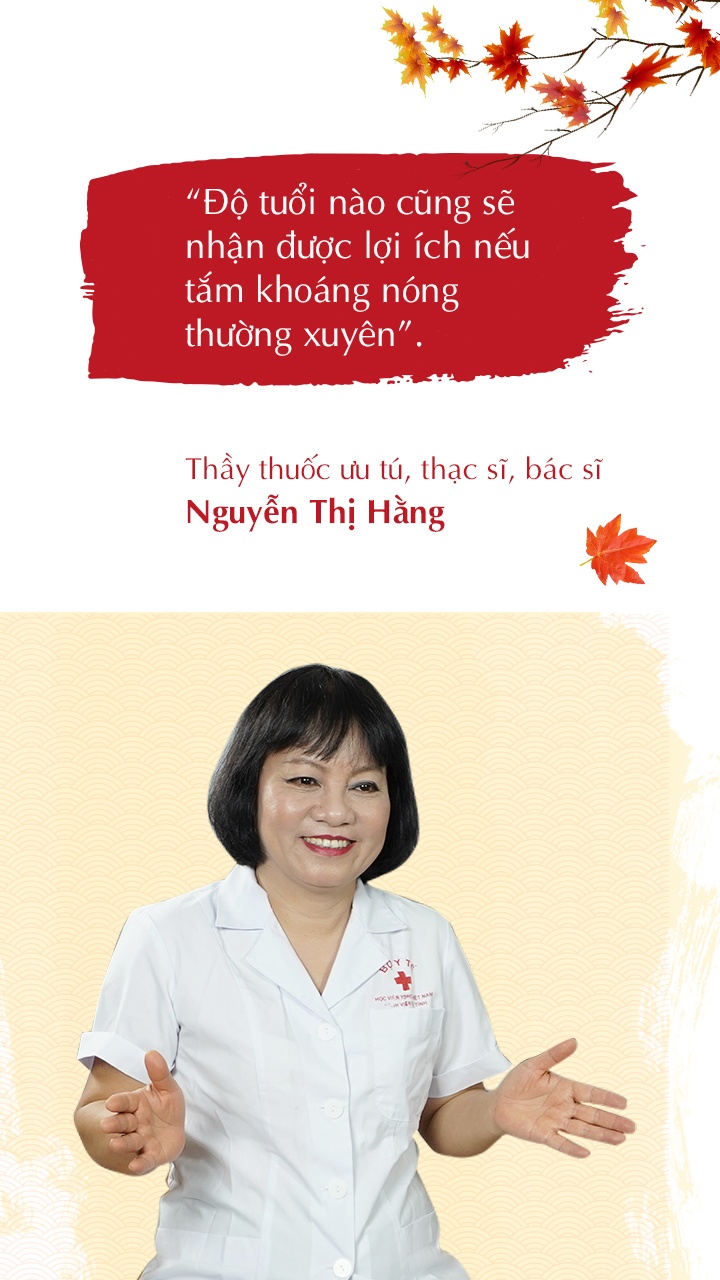 Từ xưa, con người đã biết sử dụng phương pháp tắm khoáng nóng để tăng cường sức khỏe. Theo bác sĩ Nguyễn Thị Hằng, tắm khoáng nóng cộng hưởng tác dụng từ 3 phương pháp trị liệu: Thủy, nhiệt và khoáng chất. Nhờ vậy, khí huyết cơ thể được lưu thông, dòng chảy trong huyết mạch được tăng cường, tích cực mang dinh dưỡng đến từng mô tế bào của cơ thể, giúp giảm đau mỏi xương, khớp, cơ, thần kinh…