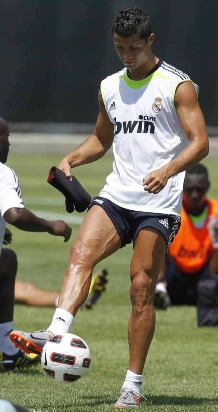 | Đôi chân cơ bắp nổi đầy gân với hai bên đầu gối biến dạng của CR7. |