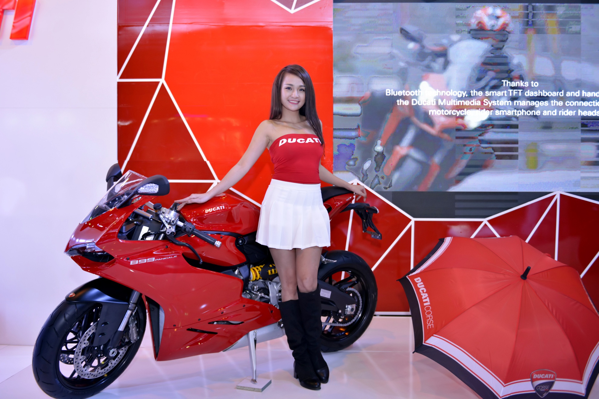 Tại một khu vực khác của triển lãm, hãng xe máy Ducati trưng bày các dòng môtô phân khối lớn mới nhất của mình, bên cạnh những cô người mẫu trẻ trung, cá tính.