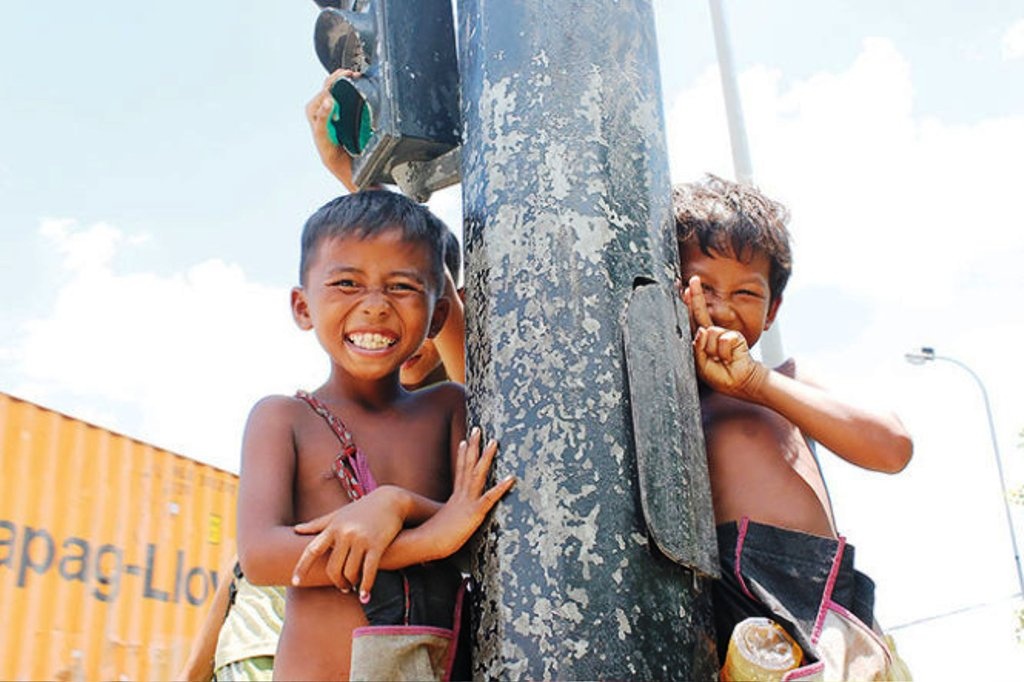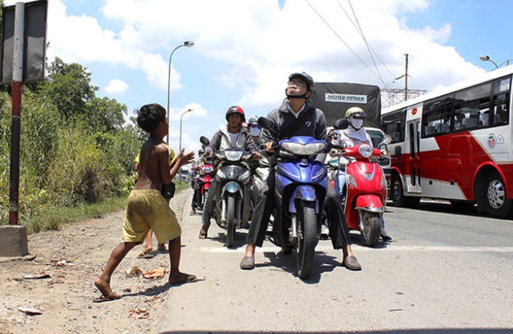 | Những đứa lớn da sạm nắng, quần áo luộm thuộm, nhếch nhác đứng dọc các trụ đèn, chờ lúc đèn đỏ chạy ào ra xin tiền. Tối đến bọn trẻ tụ tập nhau ngủ qua đêm ở các sạp rau, hành lang chợ. Những hình ảnh tội nghiệp tràn lan xuất hiện trên đường phố trong thời gian dài khiến người đi đường không khỏi xót xa, quặn thắt. Trong ảnh: Đèn đỏ, xe cộ vừa dừng, những đứa trẻ nhào ra xin tiền |