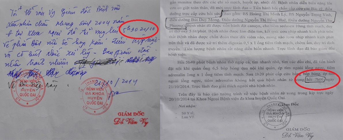 Cả điều dưỡng Trung và Giám đốc bệnh viện Đỗ Văn Vy xác nhận bệnh nhân Nguyễn Thị Hồng Nhung (10 tuổi) tử vong lúc 5h30 ngày 21/10. Tuy nhiên, trong báo cáo tường trình sự việc lên Sở Y tế Hà Nội cuối ngày 21/10, thời điểm nạn nhân tử vong lại là 7h ngày 21/10.