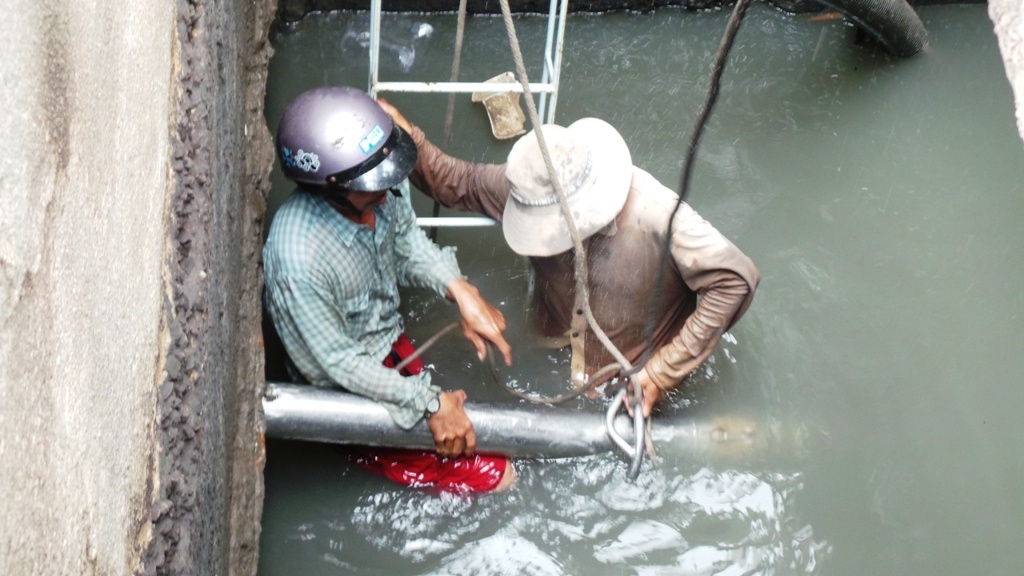Miệng cống được chặn lại, các nhân viên cứu hộ hút nước và bùn ra ngoài phục vụ công tác tìm kiếm. Theo một số nhân viên cứu hộ, bùn và rác trong cống rất dày.
