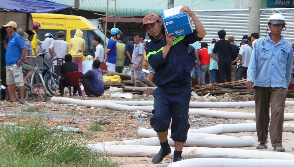 | Hàng chục thợ lặn chuyên nghiệp của lực lượng PCCC công an tỉnh Bình Dương tiếp tục công việc cứu hộ ngày thứ 2. Tuy nhiên, việc tìm kiếm thi thể cháu Tỷ không thành do một số đoạn cống hẹp, khí độc tích tụ. Dù nắng nóng nhưng người dân vẫn hăng hái cho cát vào bao tải để chặn dòng nước.