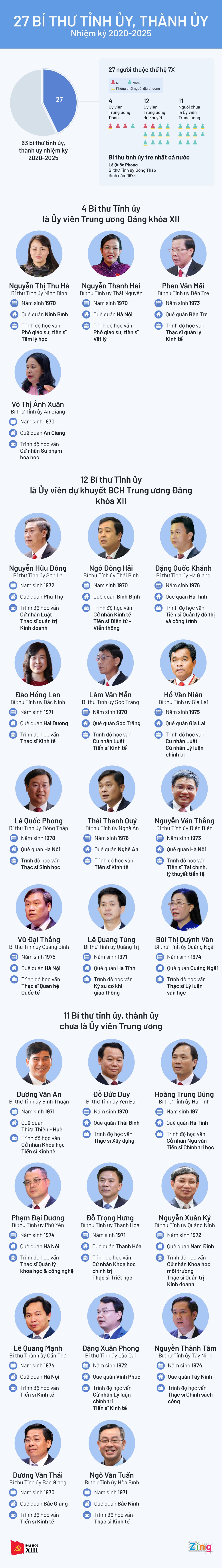 27/63 bí thư tỉnh, thành ủy thuộc thế hệ 7X, trong đó có 4 ủy viên Trung ương Đảng. Người trẻ tuổi nhất là Bí thư Đồng Tháp Lê Quốc Phong - 43 tuổi.