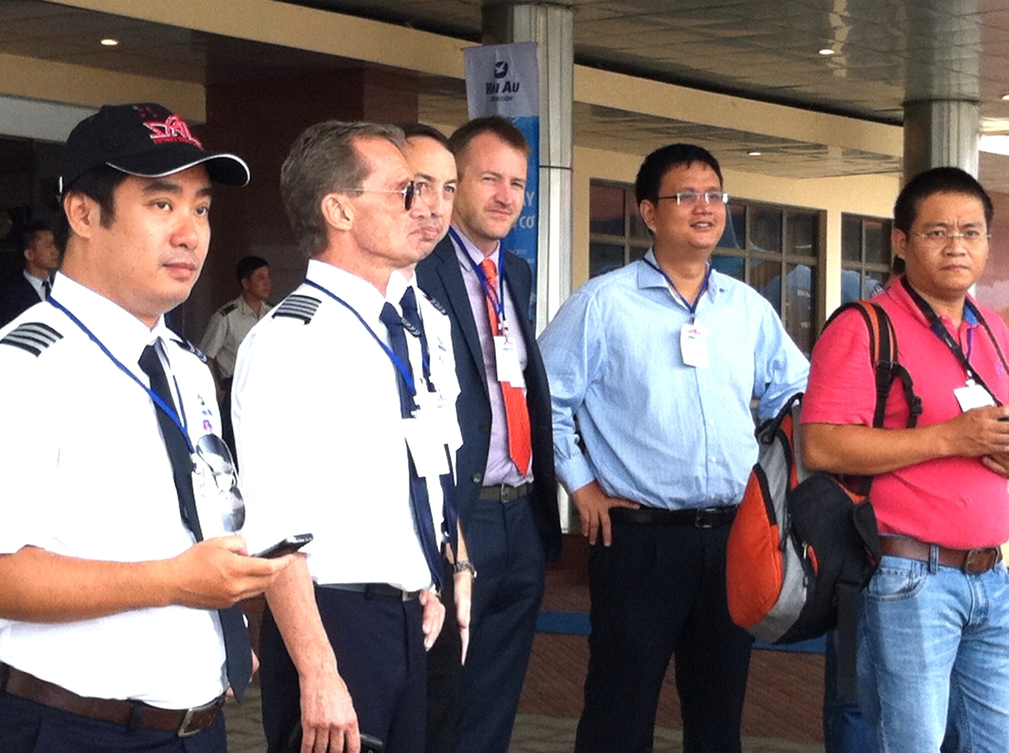 | Aaron Shaw cùng các phi công Hàng không Hải Âu chờ đón 2 thủy phi cơ về tới Nội Bài, Hà Nội ngày 21/8. Ảnh: Diệp Sa |