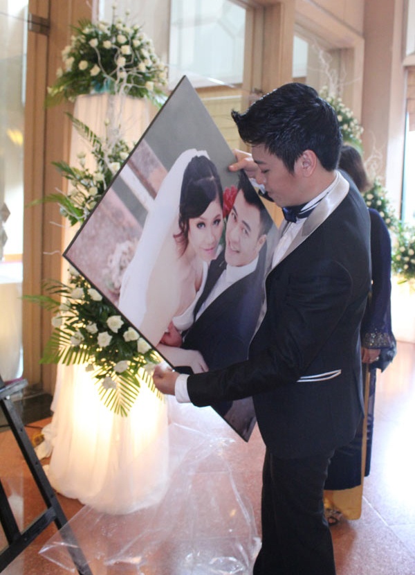 | Ca sĩ Phan Anh tự tay treo ảnh cưới cho em. |