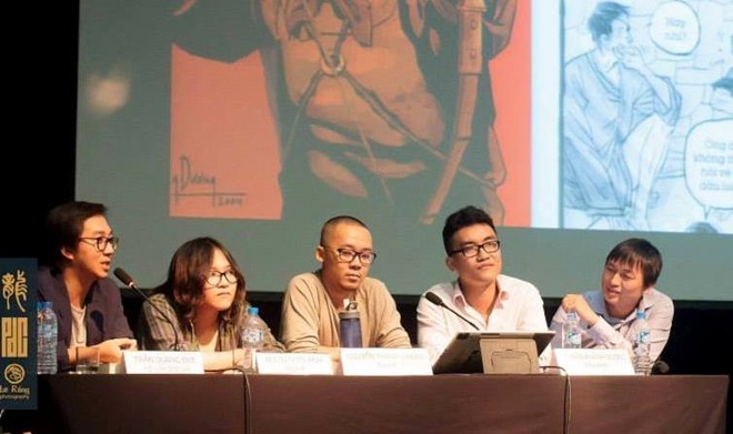 | Nhóm tác giả Long thần tướng trong dịp ra mắt tập 2 của tác phẩm tại Ngày hội truyện tranh Việt Nam 2015 (6/9 ở Hà Nội) - ngày hội được coi là một buổi biểu dương lực lượng của nền truyện tranh Việt Nam còn non trẻ và mới mẻ. Ảnh: BTC Comics Day. |