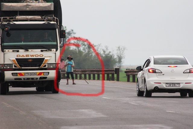 Chiều ngày 6/3, trên QL1A đoạn qua thôn Mỹ Trung xã Gia Ninh, huyện Quảng Ninh, tỉnh Quảng Bình, bất ngờ xuất hiện một người đàn ông đứng ngang nhiên giữa đường để chặn các phương tiện lưu thông trên QL1A và xin tiền.