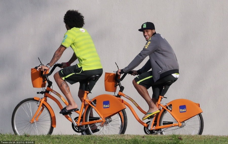 Chiều 2/7, cánh phóng viên bắt gặp Neymar đang thong dong đạp xe cùng đồng đội Marcelo tới sân tập Granja Comary tại Teresopolis. Dường như tâm trạng của Neymar đang rất thoải mái, anh cười tươi khi phát hiện ra ống kính đang chĩa về phía mình.