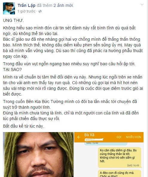 | Ngày 4/11/2015, công chúng bàng hoàng khi nghe tin nhạc sĩ Trần Lập bị bệnh ung thư và càng cảm phục hơn cách vợ chồng anh bình thản đối mặt và thể hiện quyết tâm chống chọi với bệnh tật. |