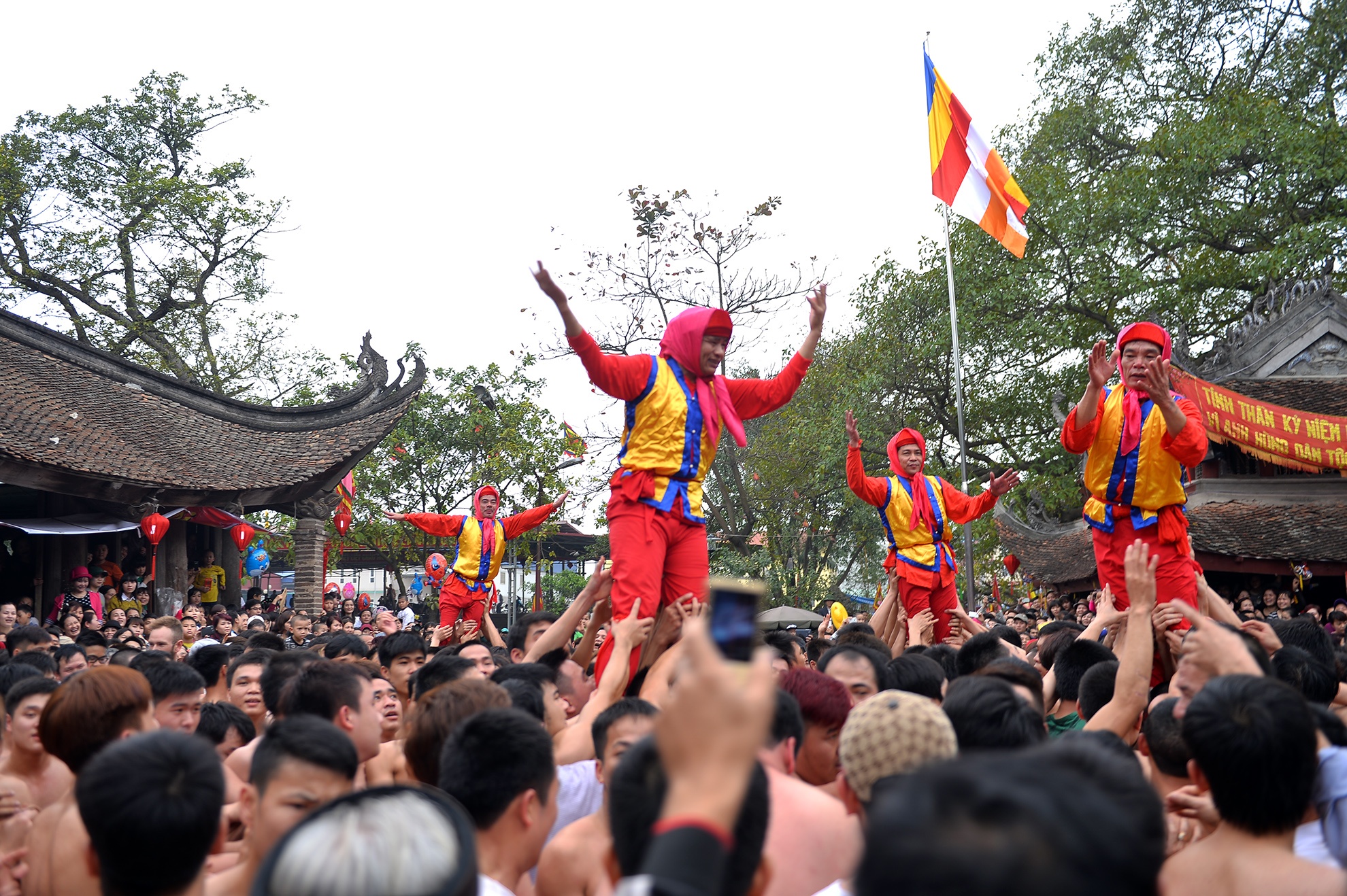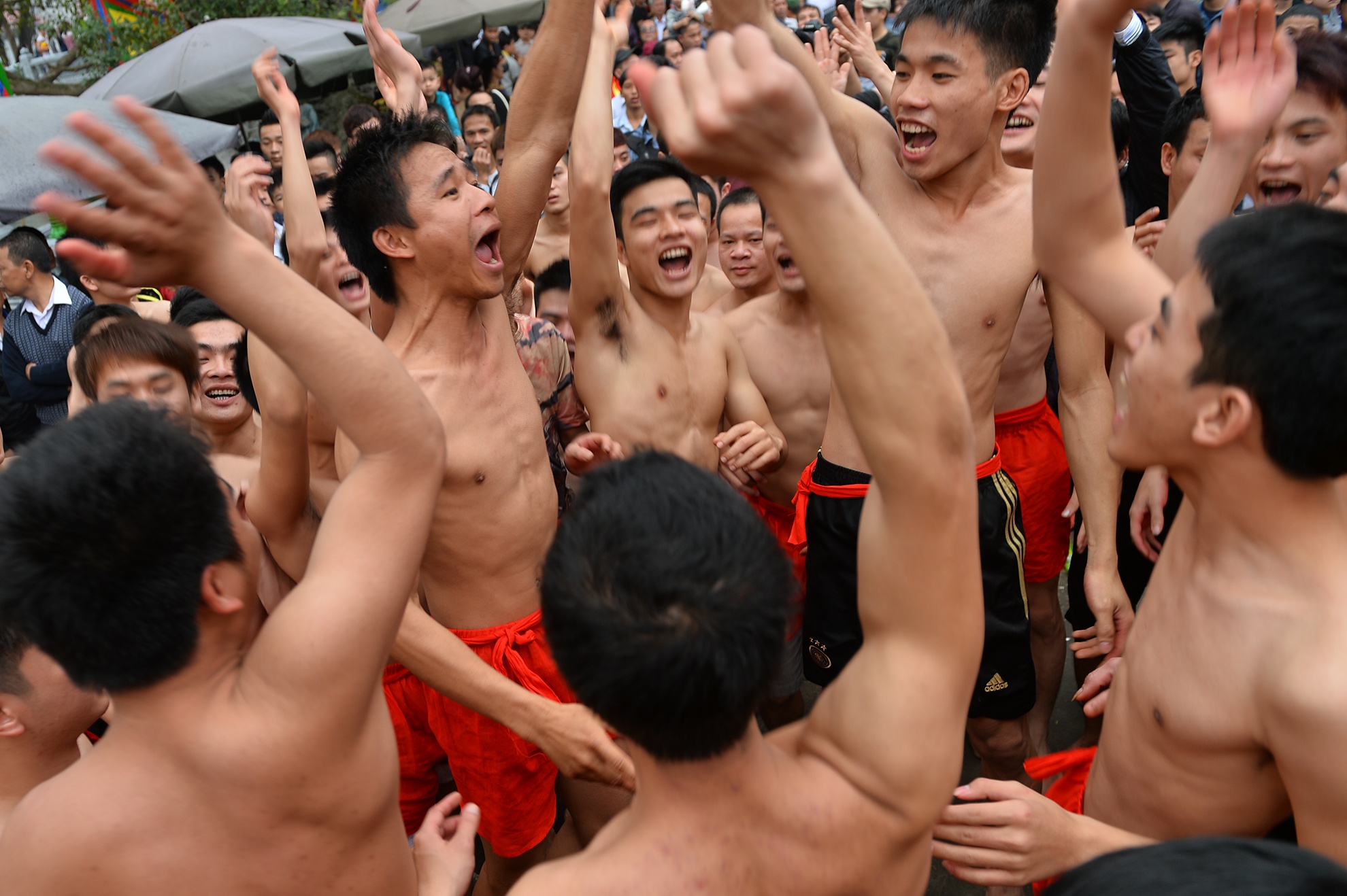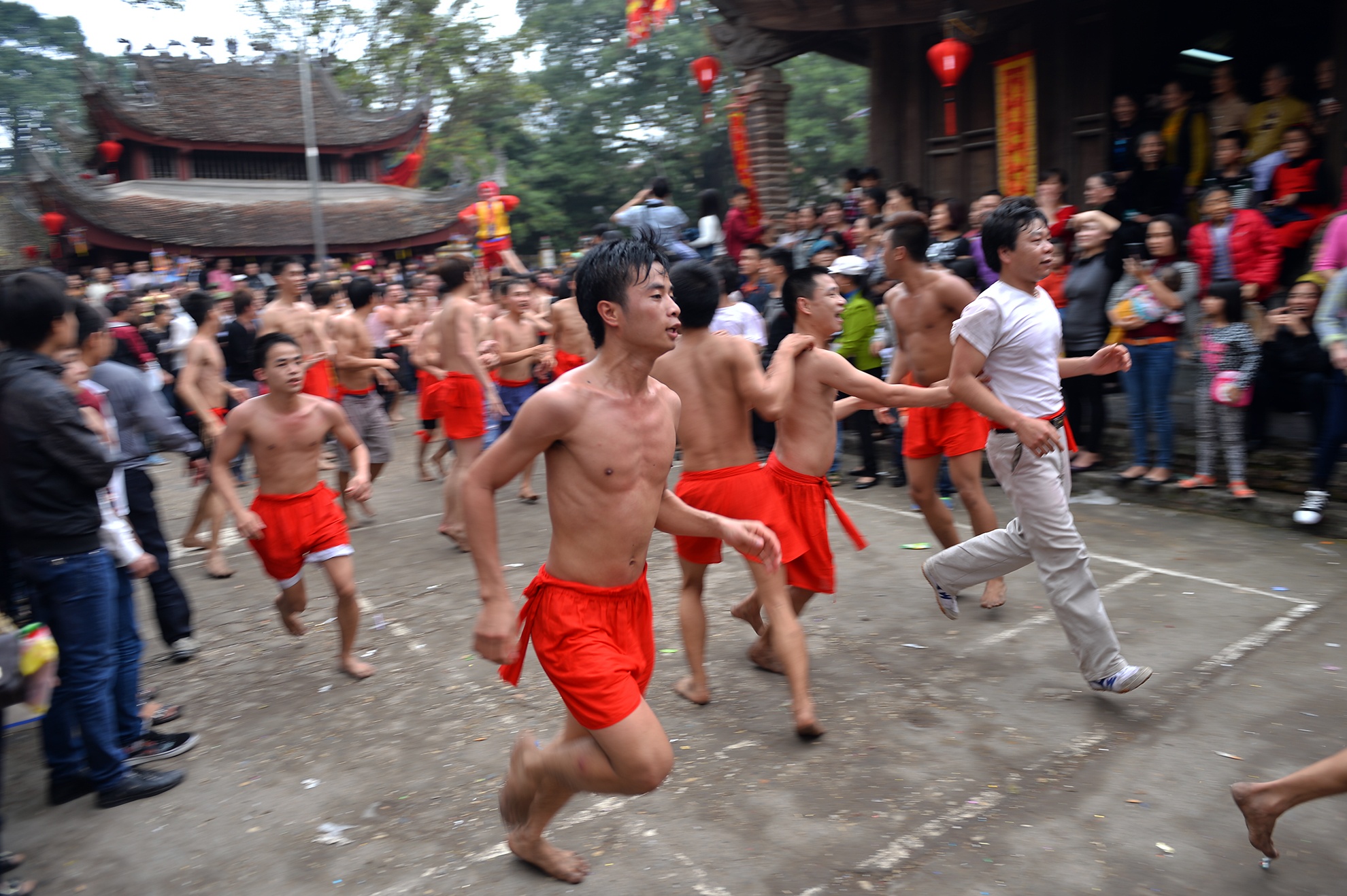 | Sau hơn 2 giờ đồng hồ đoàn rước mới tới được sân Đình. Hàng trăm thanh niên trai tráng dưới 30 tuổi cởi trần đóng khố đã chờ sẵn. |