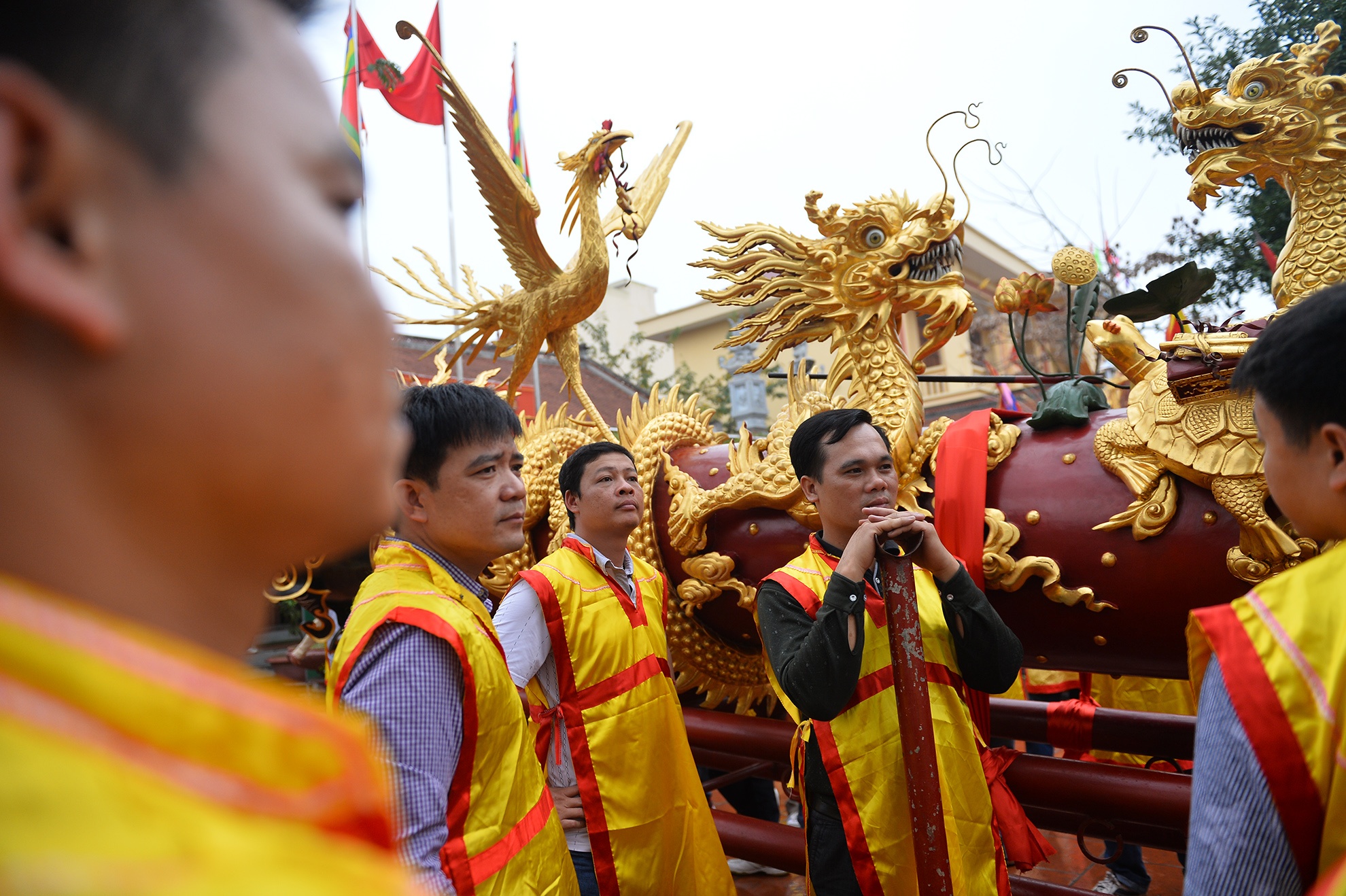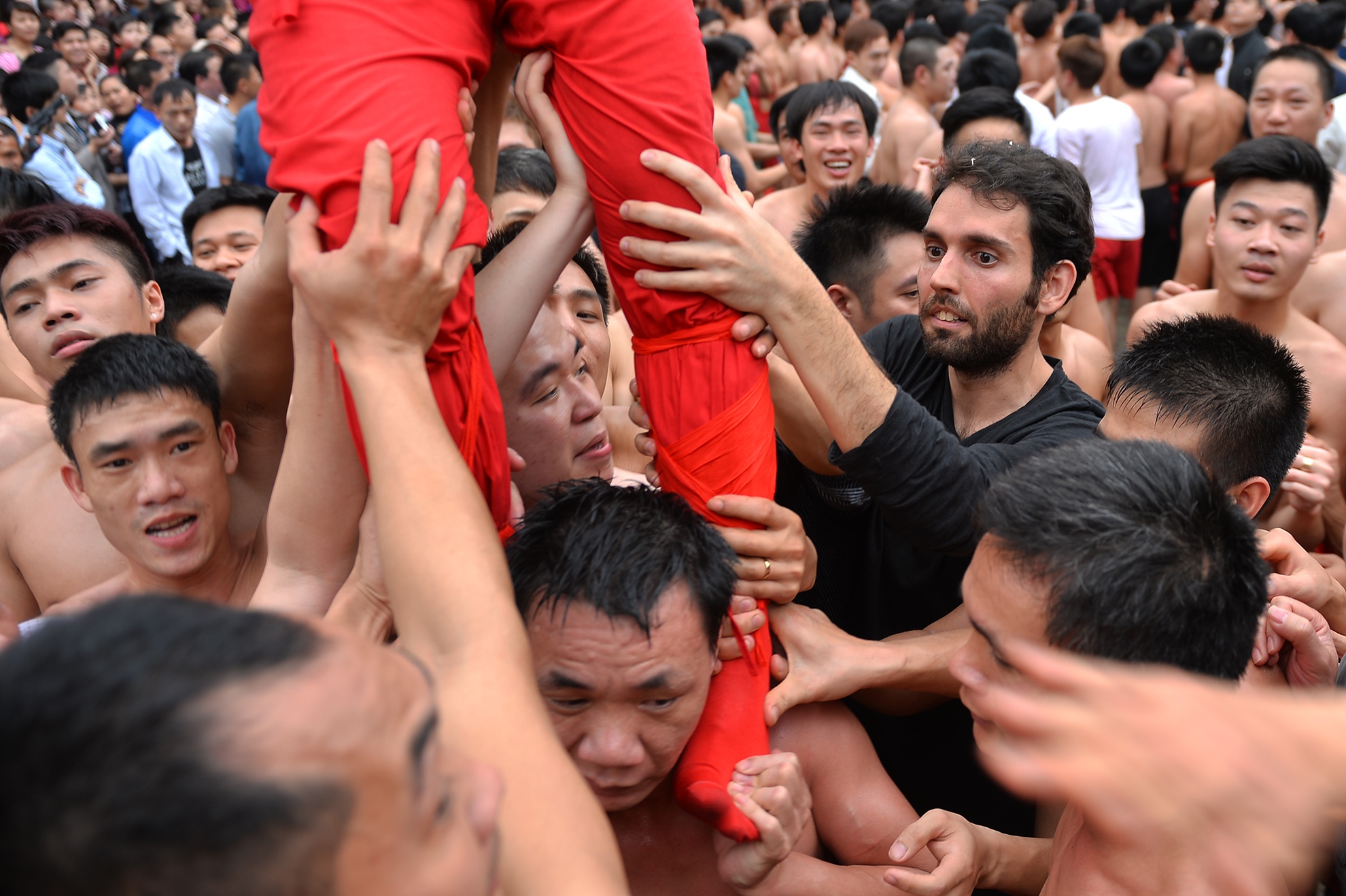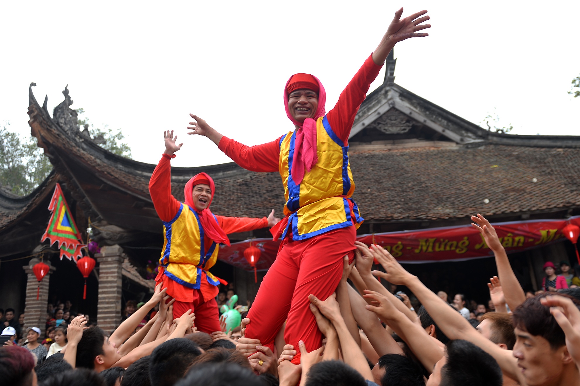 | Sau hơn 2 giờ đồng hồ đoàn rước mới tới được sân Đình. Hàng trăm thanh niên trai tráng dưới 30 tuổi cởi trần đóng khố đã chờ sẵn. |