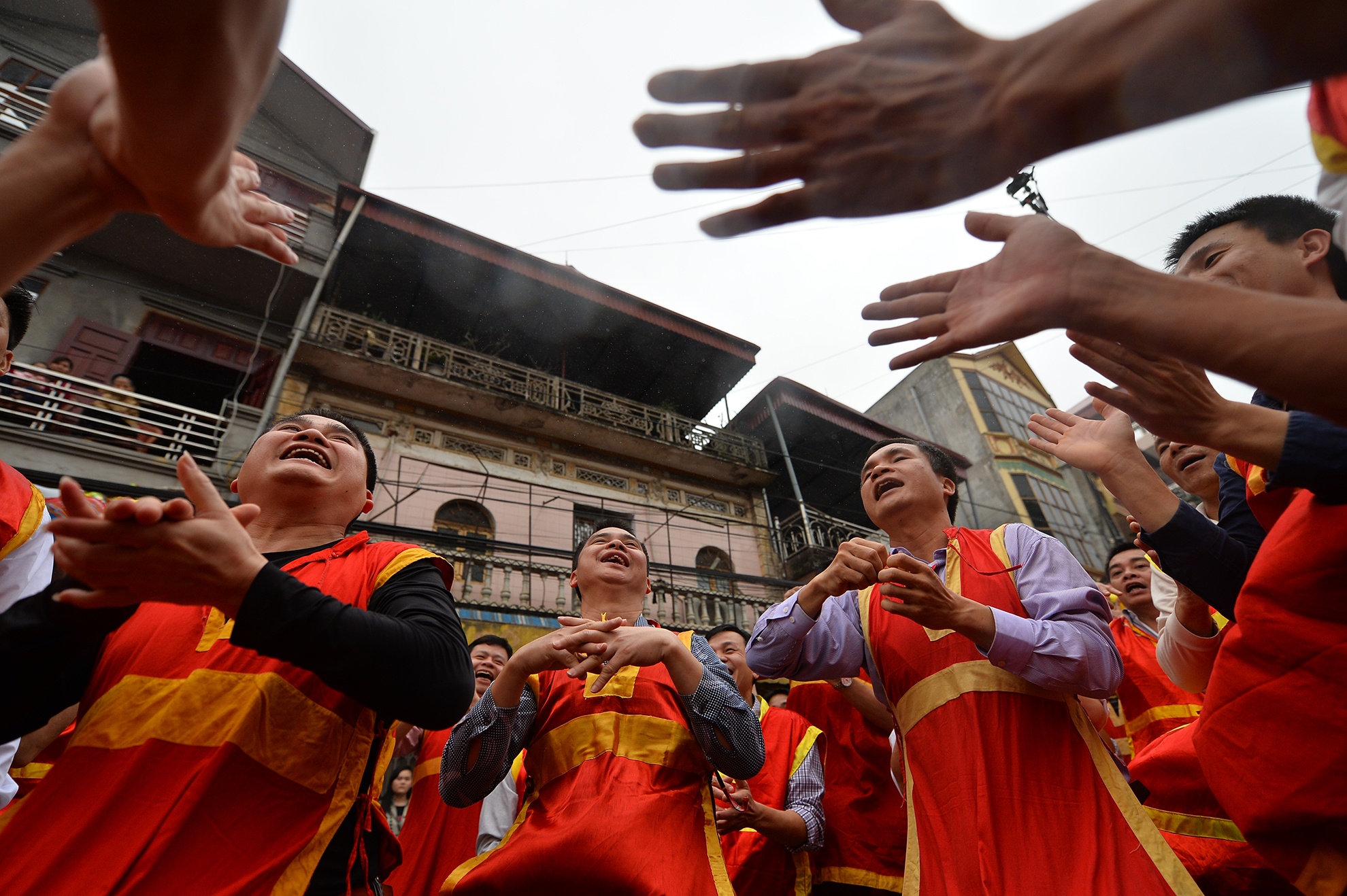 | Lần lượt mỗi đợt 30 người thay phiên nhau rước pháo. Tổng cộng có tới gần 400 trai tráng từ độ tuổi 30-50 trong làng đảm nhiệm công việc này. |