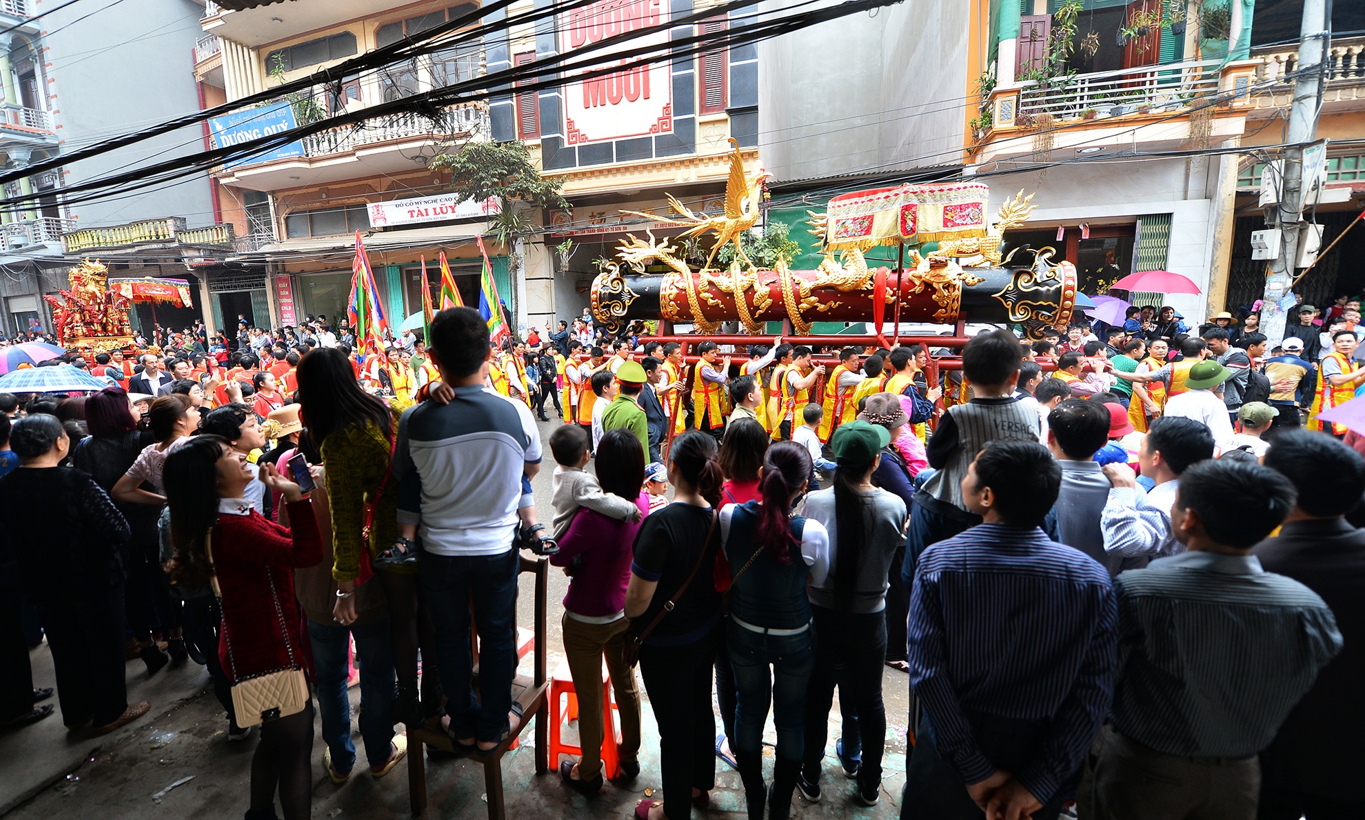 | Lễ rước bắt đầu từ 9h sáng, đoàn tham gia nối dài hàng trăm mét dọc con đường chính từ đầu làng về sân đình. |