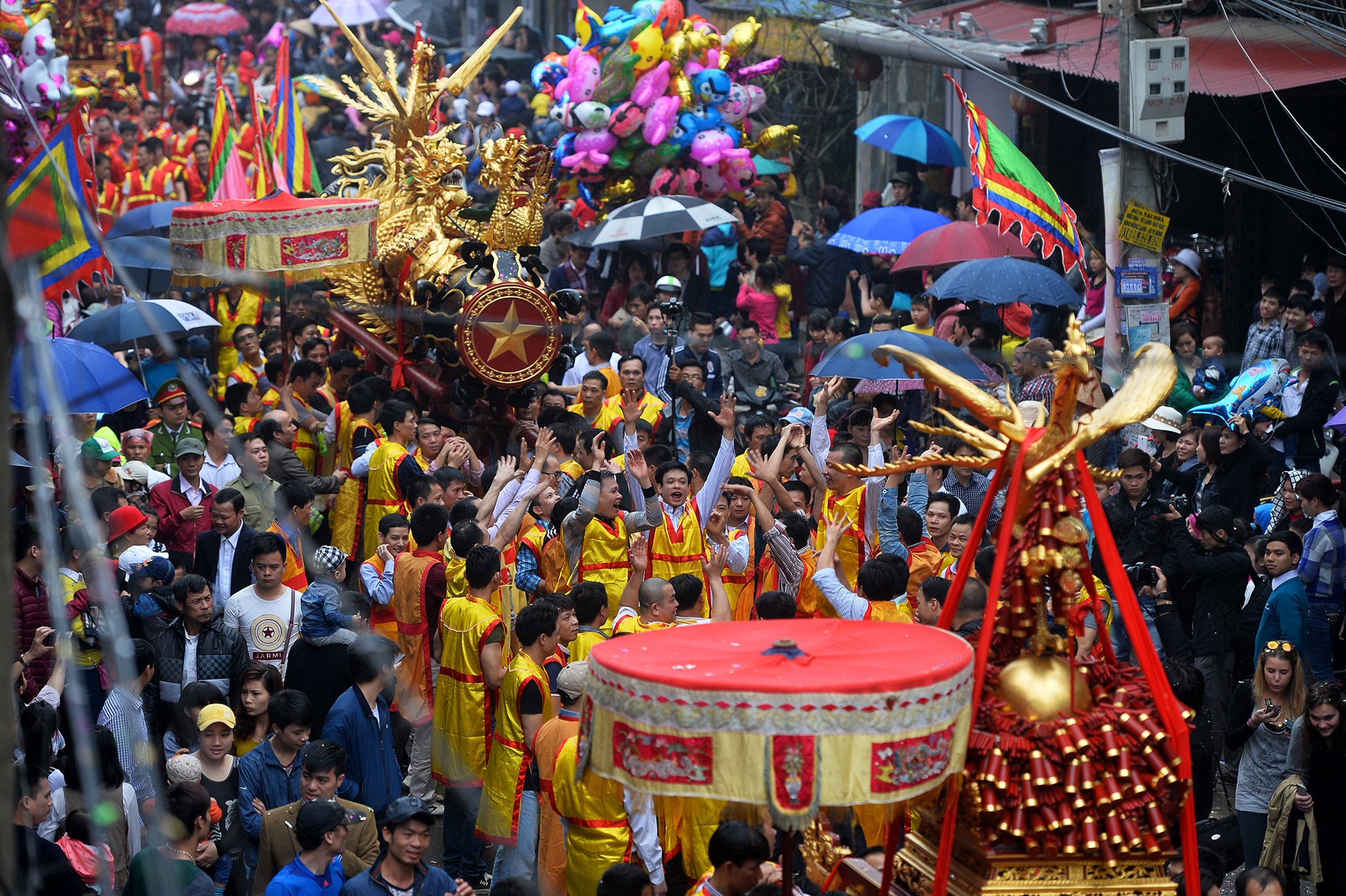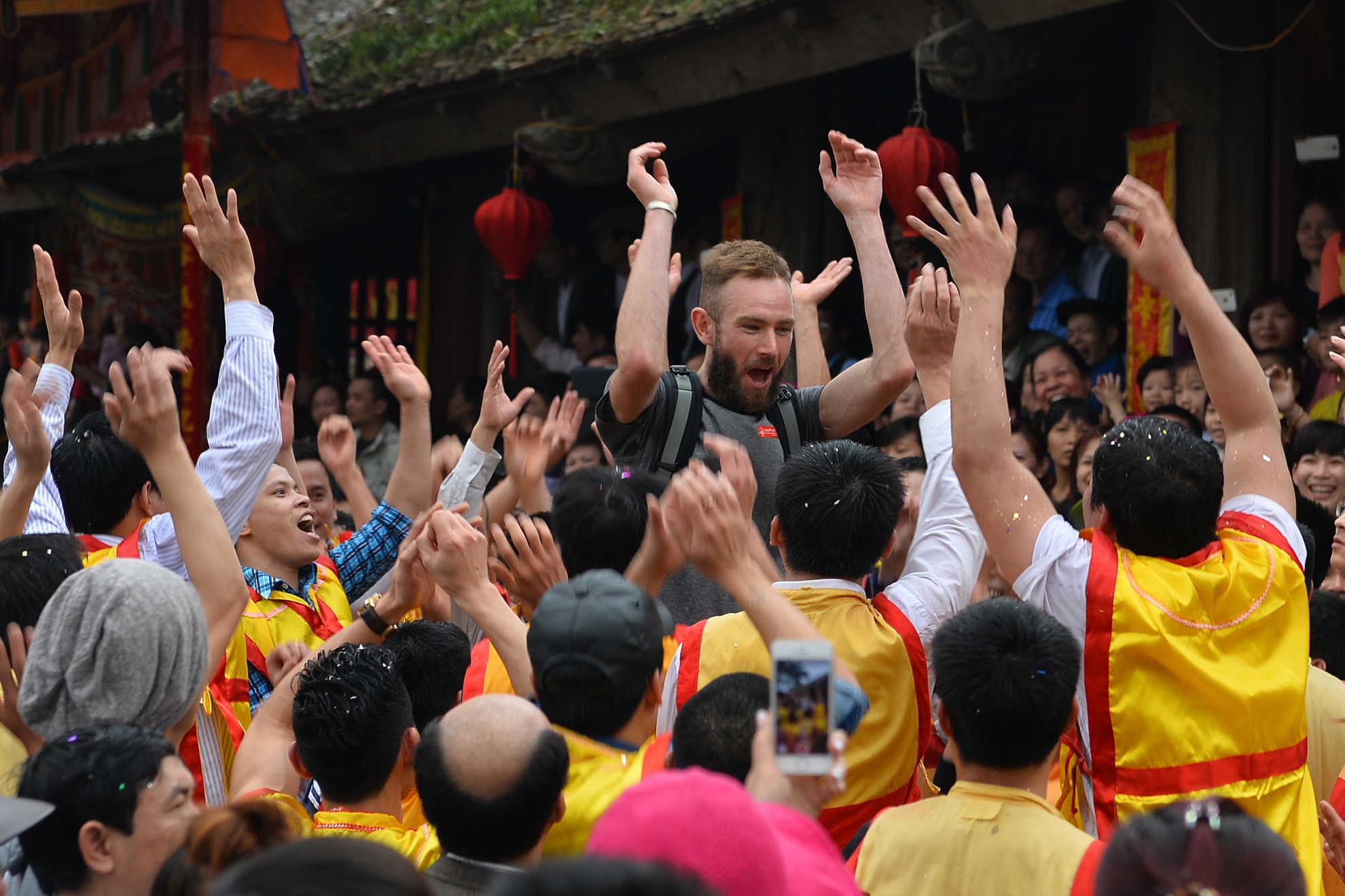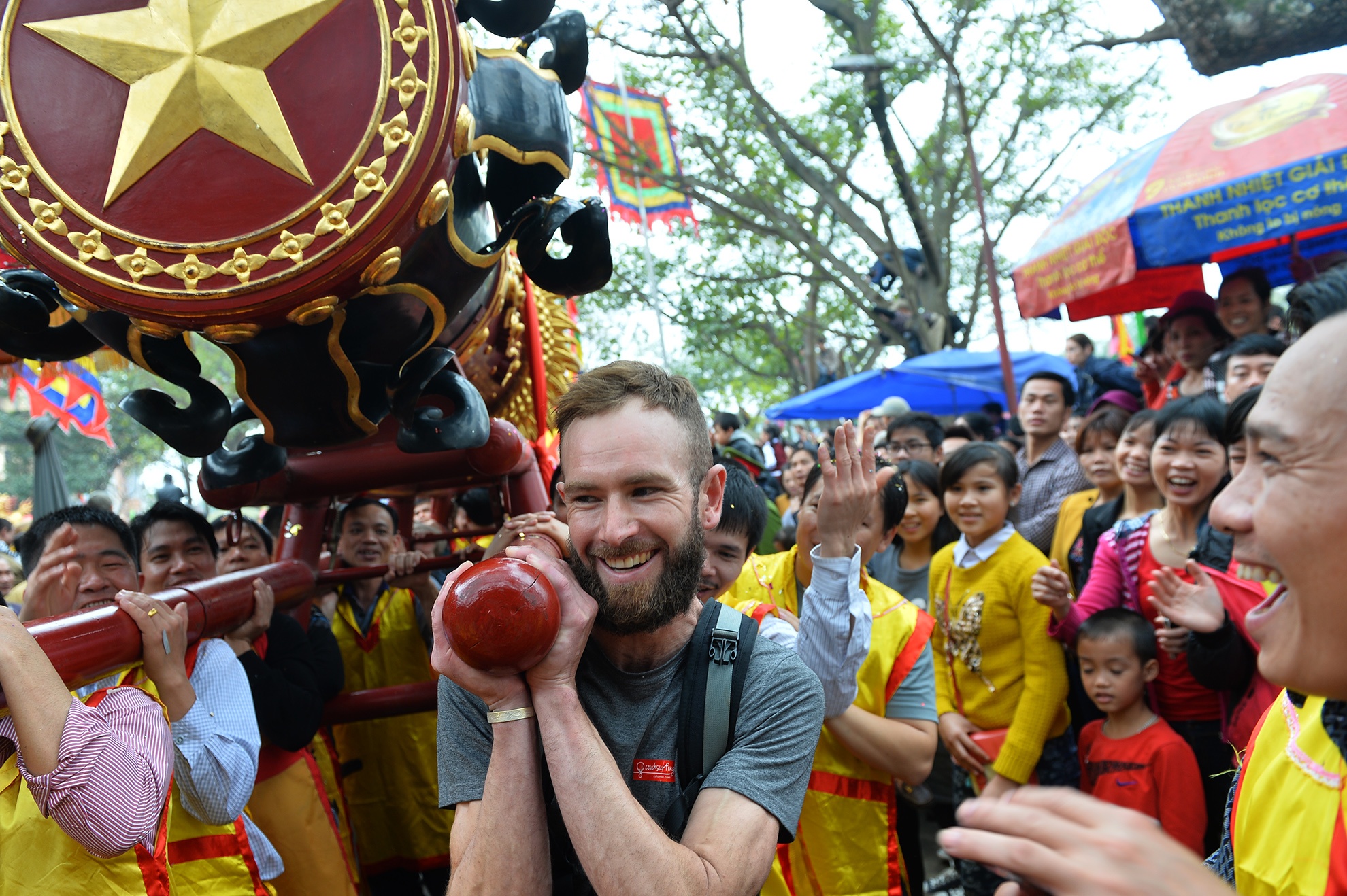 | Đặc biệt, năm nay có một sự đặc cách dành cho du khách, được rước tượng trưng quả pháo rồng khổng lồ của làng. Người có vinh dự này là anh Daniel Toohey (31 tuổi, người Australia). |