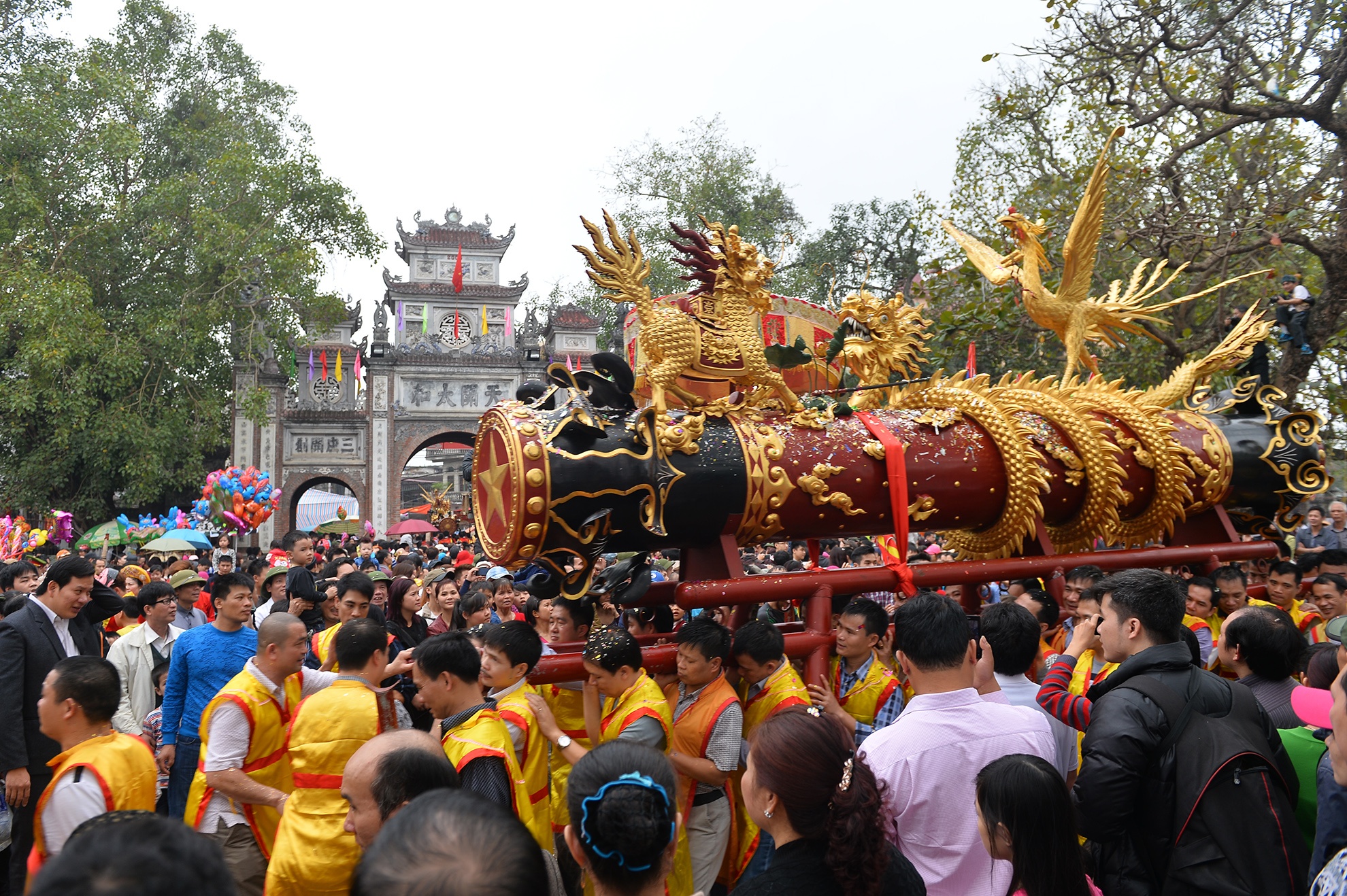 | Tâm điểm của hội Đồng Kỵ là lễ rước hai quả pháo gỗ khổng lồ chiều dài 6 m, được chạm trổ tinh xảo, trang trí long ly quy phượng. |