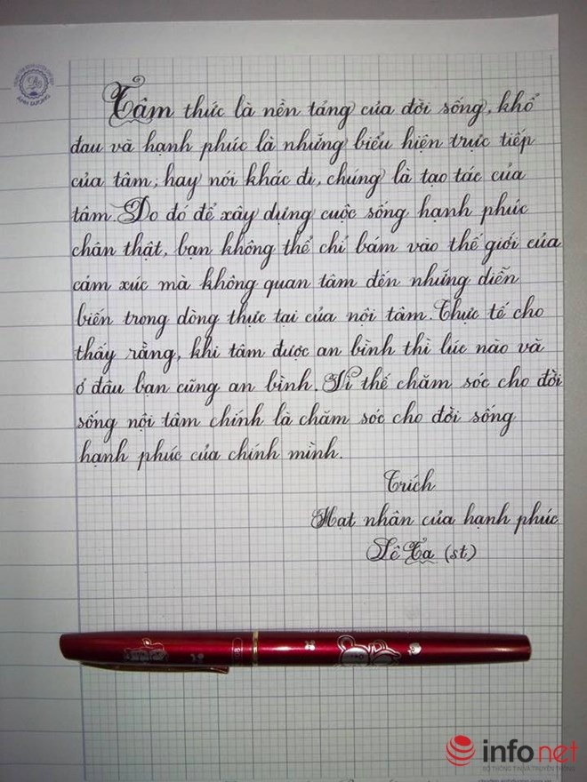 Chàng thạc sĩ phủ Thiên Trường còn tâm sự thêm: “Trước đây chữ cũng xấu do học thiên về các môn tự nhiên nhưng lớp 12 chuyển khối học sang khối C bị thầy giáo dạy văn chê “chữ anh xấu thế này thi khối C thì trượt đầu nước”, thế là mình đi mượn vở của mấy bạn gái viết đẹp cùng khối về phân tích và luyện theo khoảng 2 tuần. Chữ khá hơn, rõ ràng, dễ nhìn, dễ đọc so với trước rất nhiều.