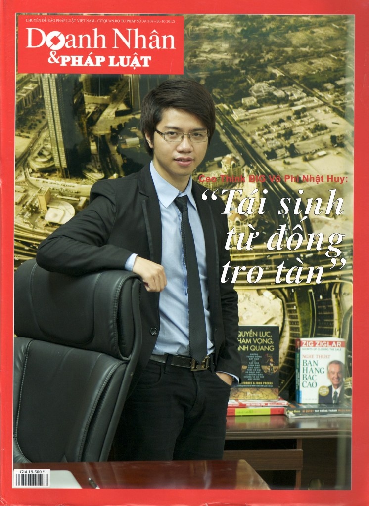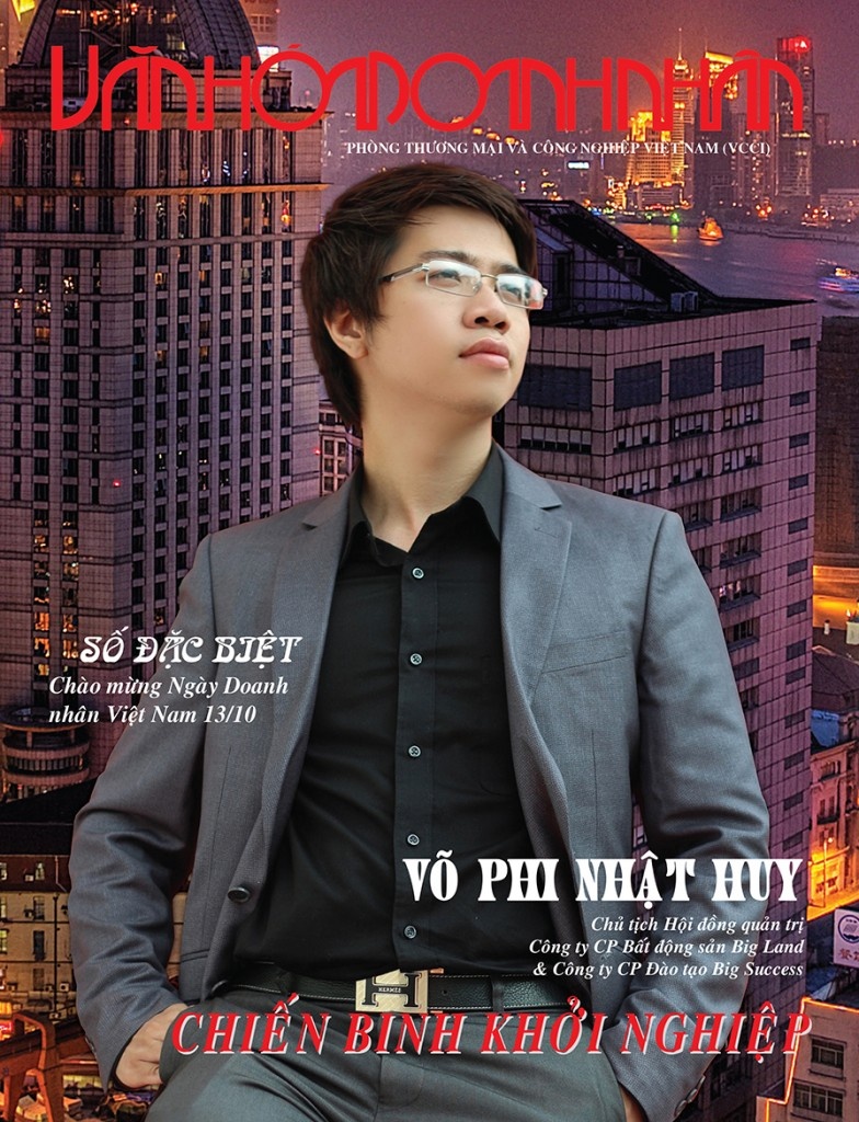 | Võ Phi Nhật Huy trên trang bìa tạp chí Văn hoá doanh nhân với câu chuyện Chiến binh khởi nghiệp. |