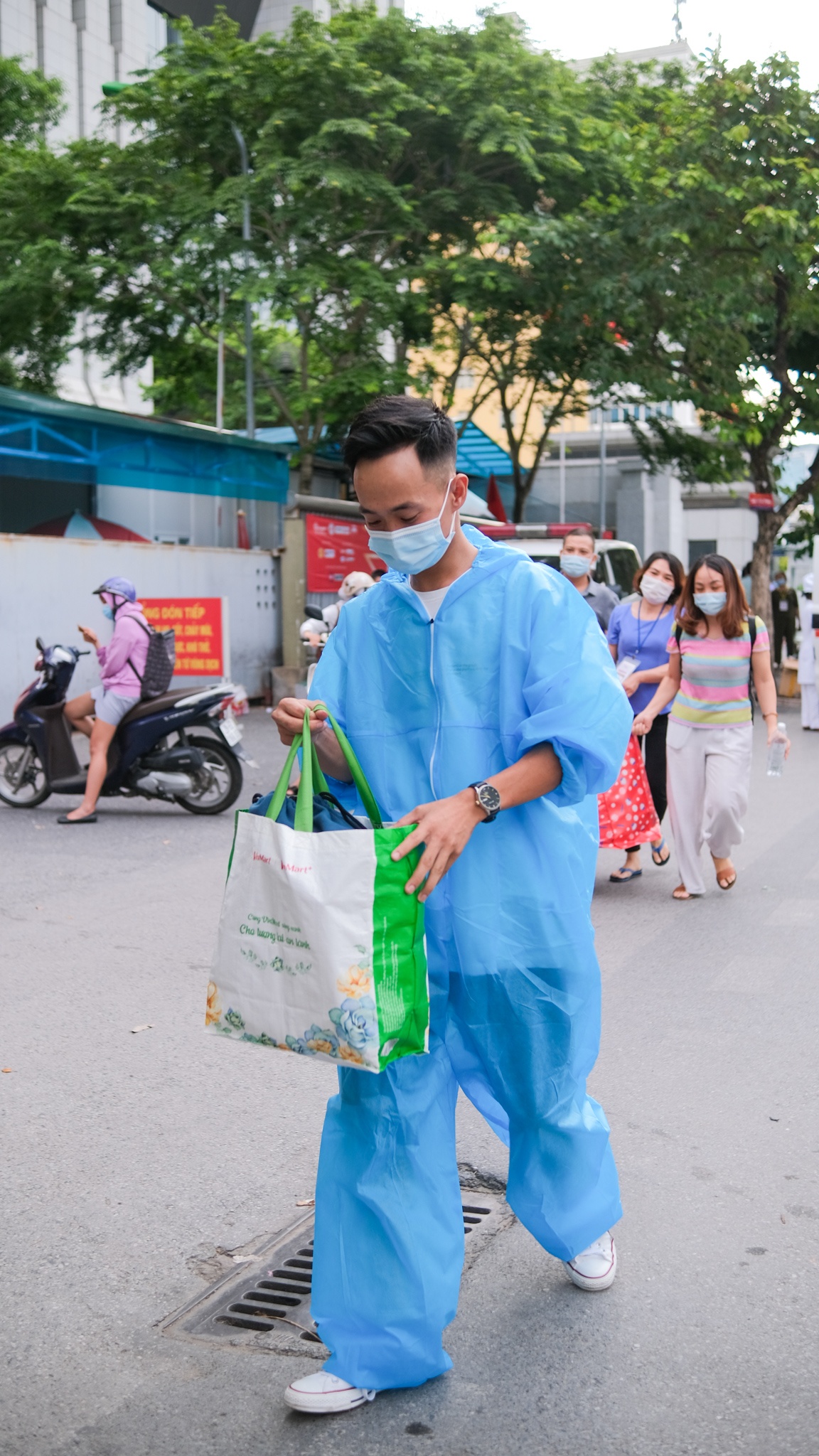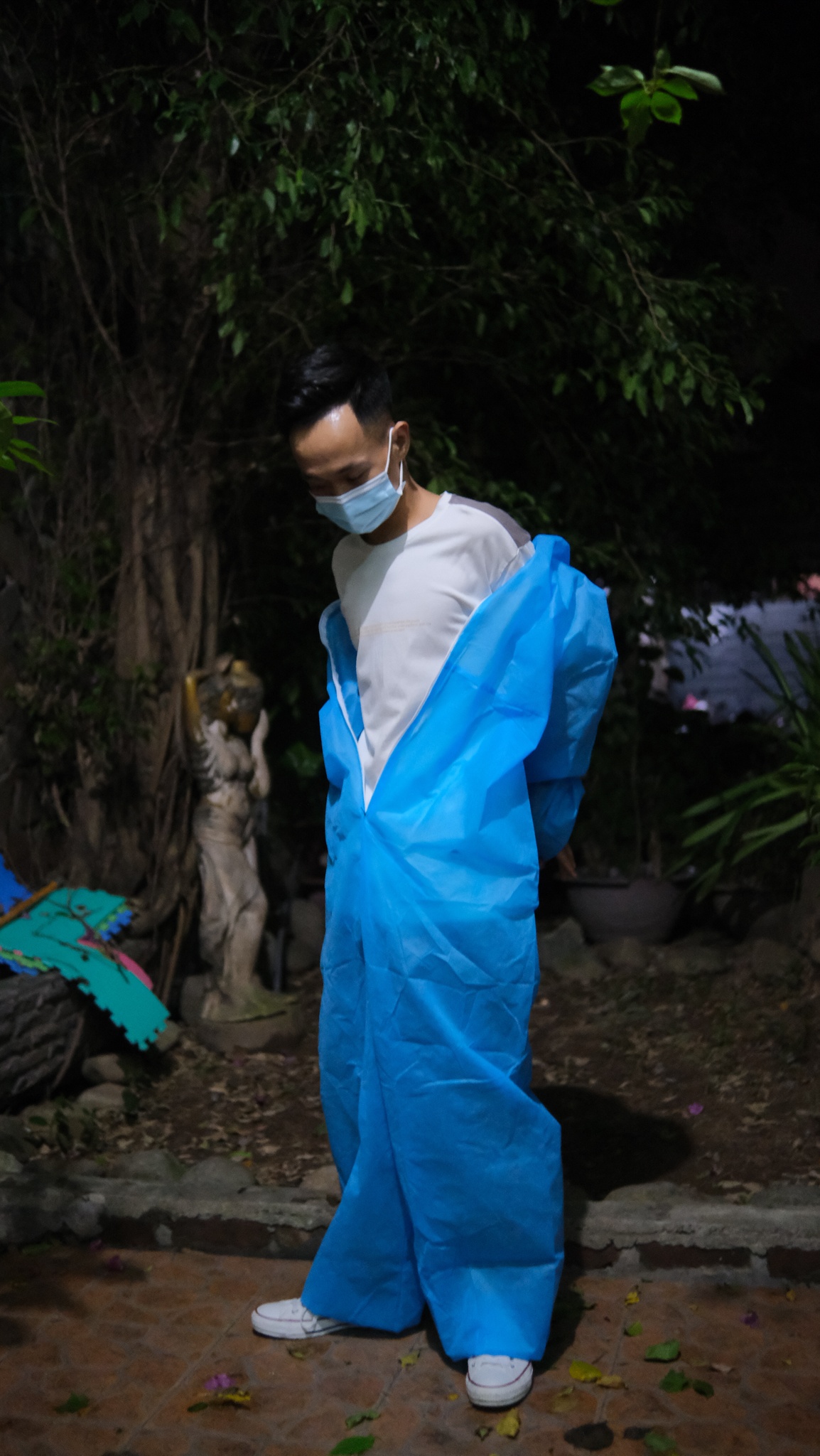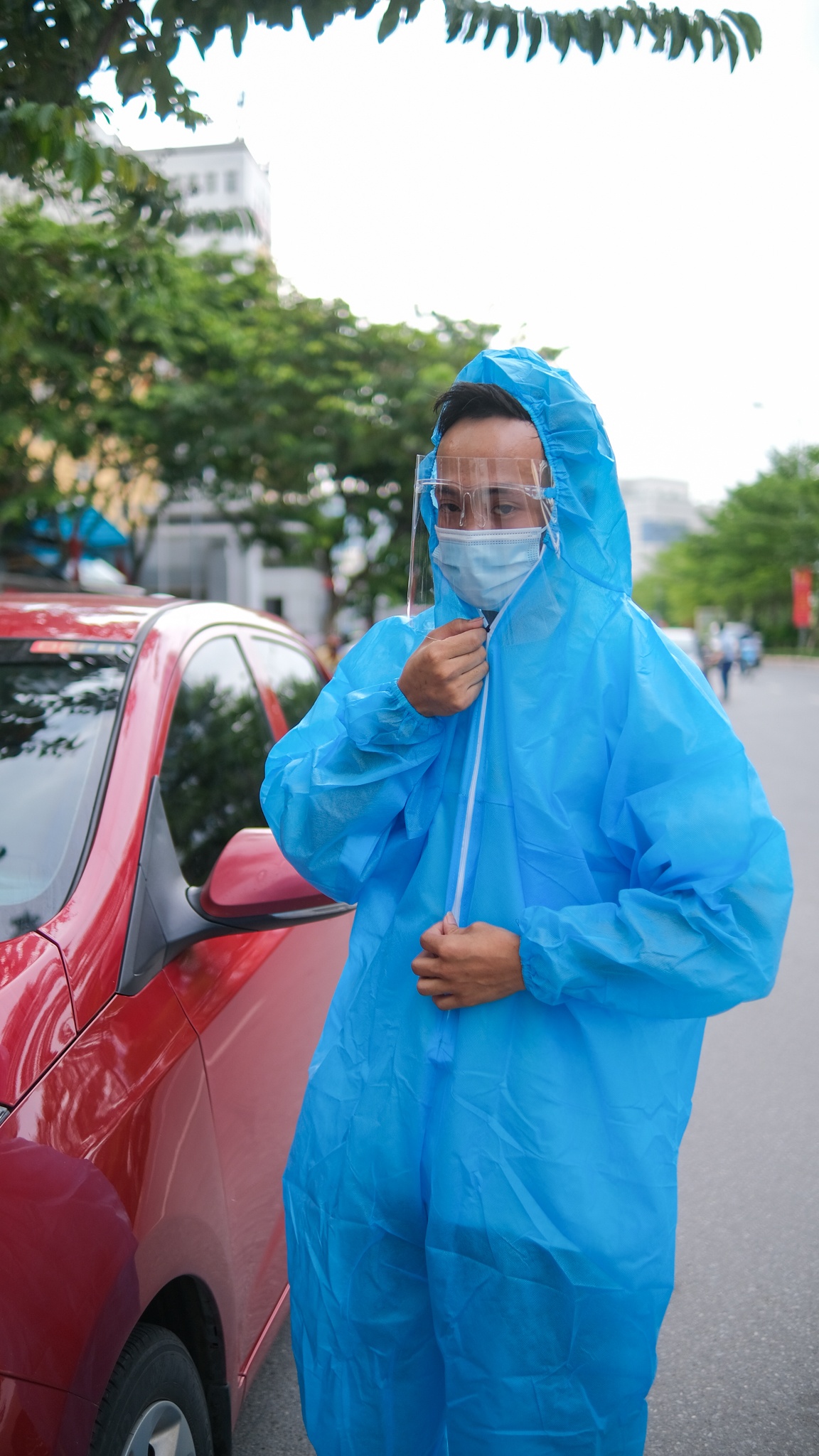 | Đến cổng Viện Huyết học - Truyền máu Trung ương, tôi mặc đồ bảo hộ. Với chiều cao 1m67 và cân nặng chỉ 50 kg, trông tôi khá nhỏ bé trong bộ đồ này. |