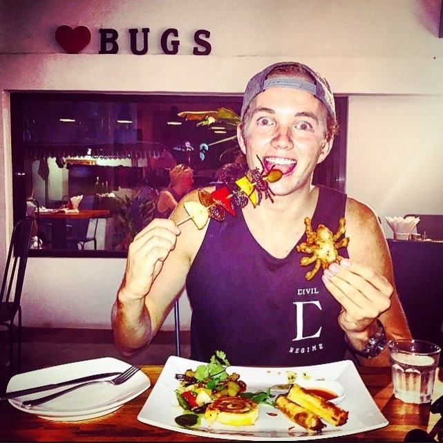| Anh cũng đã thưởng thức nhiều món ăn lạ, như chim puffin ở Iceland, tằm ở Hàn Quốc, bánh nhện ở Campuchia...