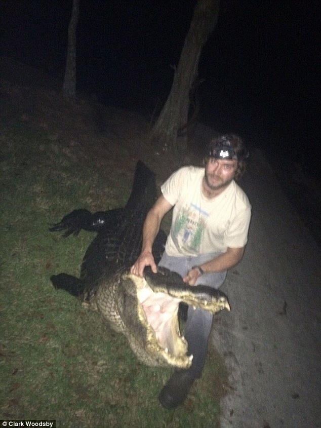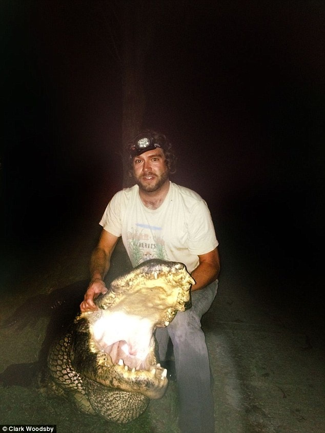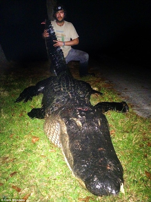 | Clark Woodsby, một thợ săn hợp pháp sống tại thành phố Lakeland, bang Florida, Mỹ, hạ gục thành công con cá sấu "khủng" nặng tới 326 kg. Bức ảnh chụp chàng thanh niên và con quái vật đã bị trói chặt. |