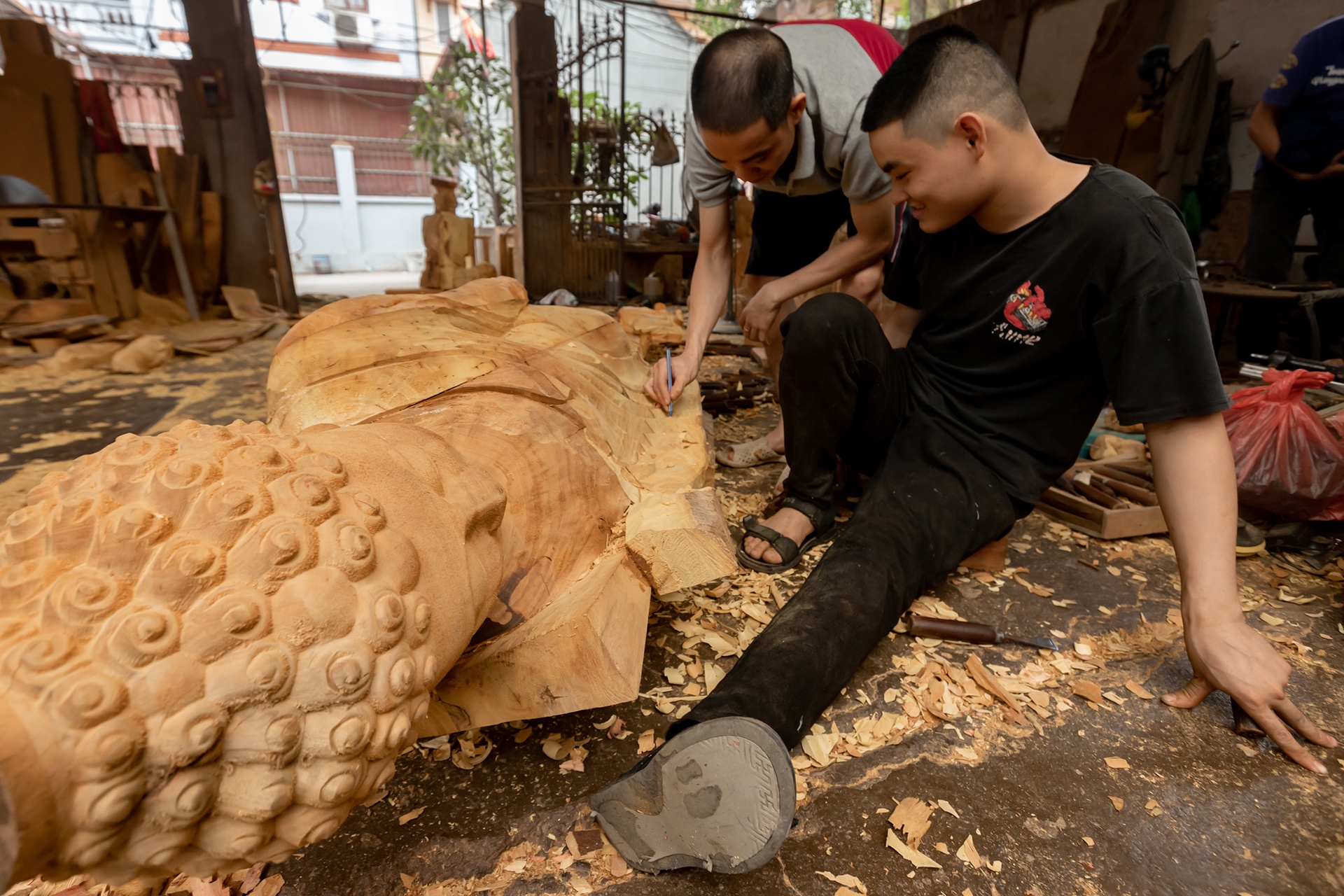 | Nguyễn Như Anh Trung, sinh ra lớn lên ở làng nghề sơn thếp mộc truyền thống Sơn Đồng, huyện Hoài Đức, Hà Nội. Anh được học nghề chạm khắc gỗ từ năm 12 tuổi. Hiện giờ chàng trai 23 tuổi rất thạo nghề và đảm đương được nhiều công việc khó. "Tôi đang đục phần mặt của tượng, đây là việc đòi hỏi kỹ thuật và mỹ thuật cao", Trung vừa làm vừa tâm sự. |