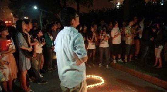 | Màn tỏ tình này diễn ra vào khoảng hơn 9h tối qua (ngày 13/10) tại đại học Tài chính và Kinh tế Thượng Hải, thành phố Thượng Hải, Trung Quốc. Một chàng trai với dáng vẻ thư sinh lấy hết can đảm thổ lộ tình cảm với người con gái trong mộng. Sự si tình của anh chàng khiến bác bảo vệ cũng “nhập cuộc” giúp anh chàng chuẩn bị. |