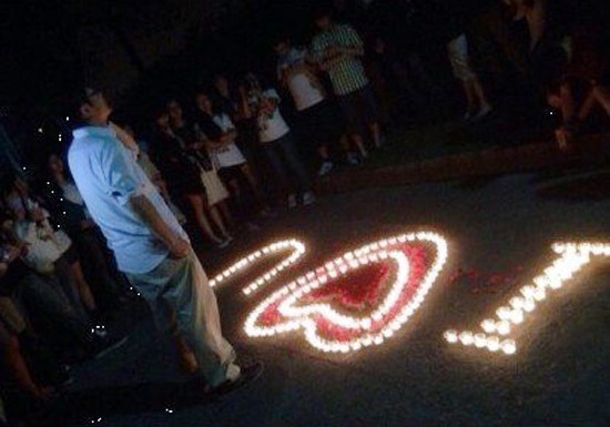 Chàng trai có vẻ hơi lo lắng và hồi hộp. Anh chàng thắp rất nhiều nến và hoa hồng xếp thành chữ “I LOVE U” vô cùng đẹp và lãng mạn. Hành động của chàng trai thu hút rất nhiều bạn trẻ hiếu kỳ đứng xem, có không ít người cổ vũ, thậm chí một bác bảo vệ còn hăng hái giúp anh chàng một tay. Ai cũng háo hức đón chờ một màn tỏ tình với kết thúc thật đẹp.