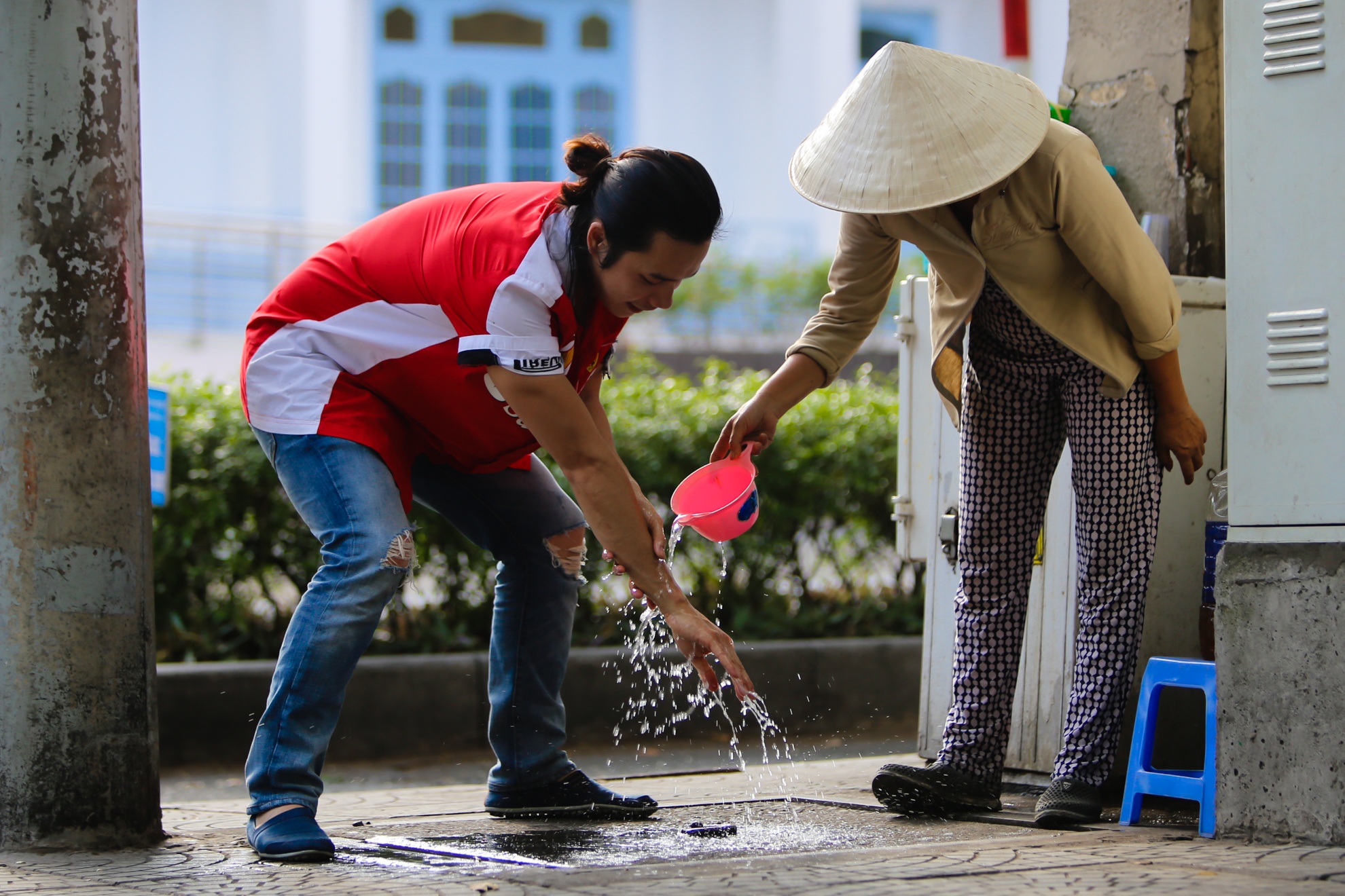 | Sau khi hớt tóc xong cho một khách anh lại ra quán nước gần đó xin rửa tay cho sạch sẽ để tiếp tục phục vụ người khác. |