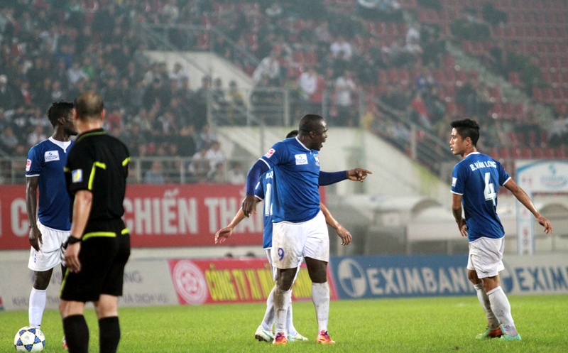| Đội khách HAGL gặp chút sự cố khi Timothy tranh đá phạt với các đồng đội. |