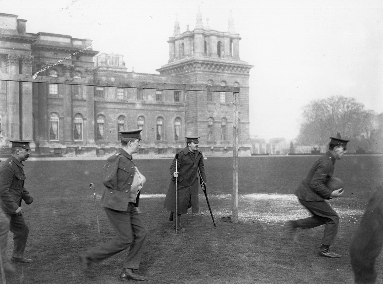| Thương binh chơi bóng đá ở cung điện Blenheim, Woodstock, Anh năm 1916. Ảnh sau chụp những đứa trẻ chơi bóng bên ngoài cung điện tháng 7/2014. |