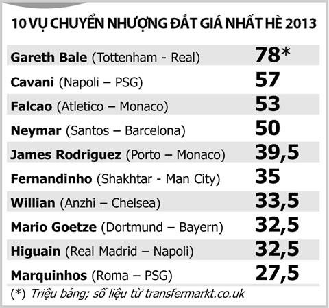 Người ta nhẩm tính, nếu những quả bom tiềm năng thực sự phát nổ trong ngày chuyển nhượng cuối cùng (Fellaini, Baines, Oezil, Di Maria…) Hè 2013 sẽ xác lập một kỷ lục vô tiền khoáng hậu về số tiền mà 5 giải đấu lớn chi ra để sắm sửa tân binh (ước tính rơi vào khoảng… 1,9 tỉ bảng).