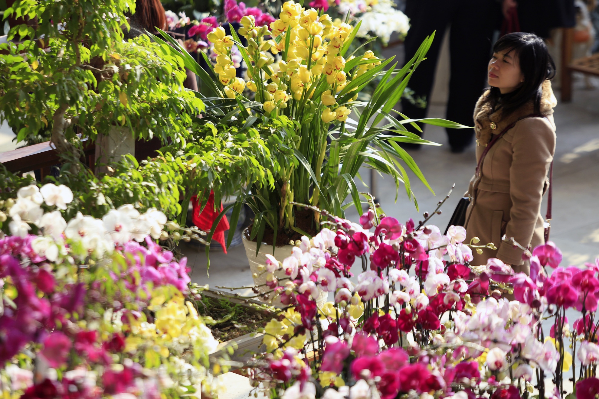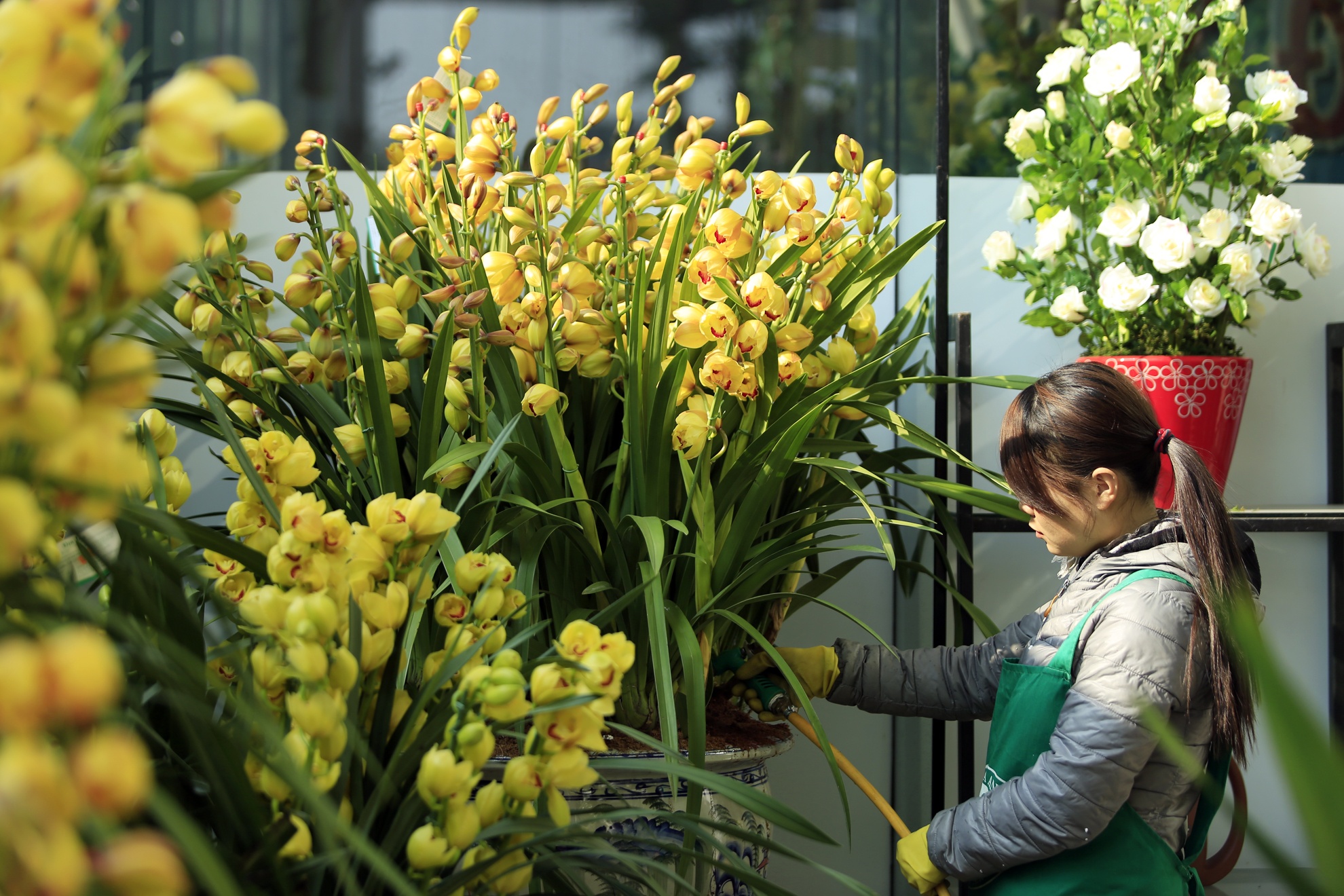 Nhân viên siêu thị hoa chăm sóc đặc biệt cho các chậu địa lan giá chục triệu.