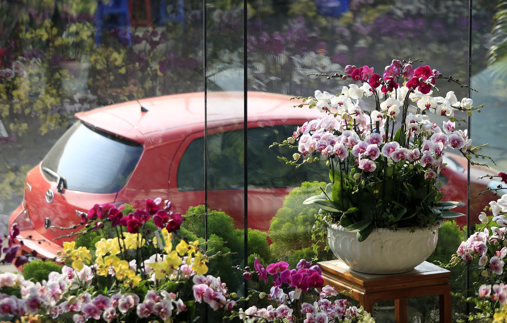 Chậu địa lan Đà Lạt với hàng trăm cành hoa vàng, tím khác nhau được bán với giá hơn 40 triệu đồng tại một siêu thị hoa ở Hà Nội.