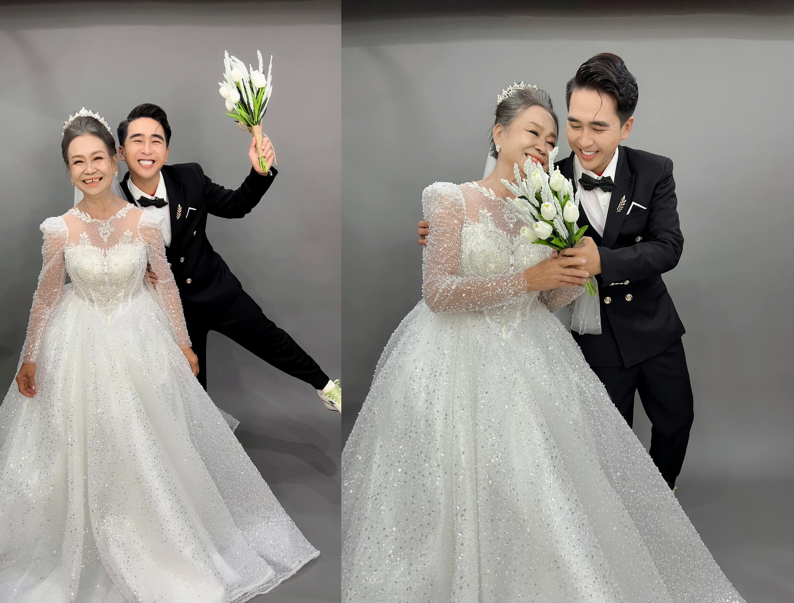 Sau khi được trang điểm theo phong cách cô dâu hiện đại, khoác lên người bộ váy cưới trắng tinh, bà Mến khiến ê-kip chụp ảnh ngỡ ngàng. Để bộ ảnh cưới trọn vẹn, Nhí quyết định biến mình thành chú rể đứng cạnh bà.