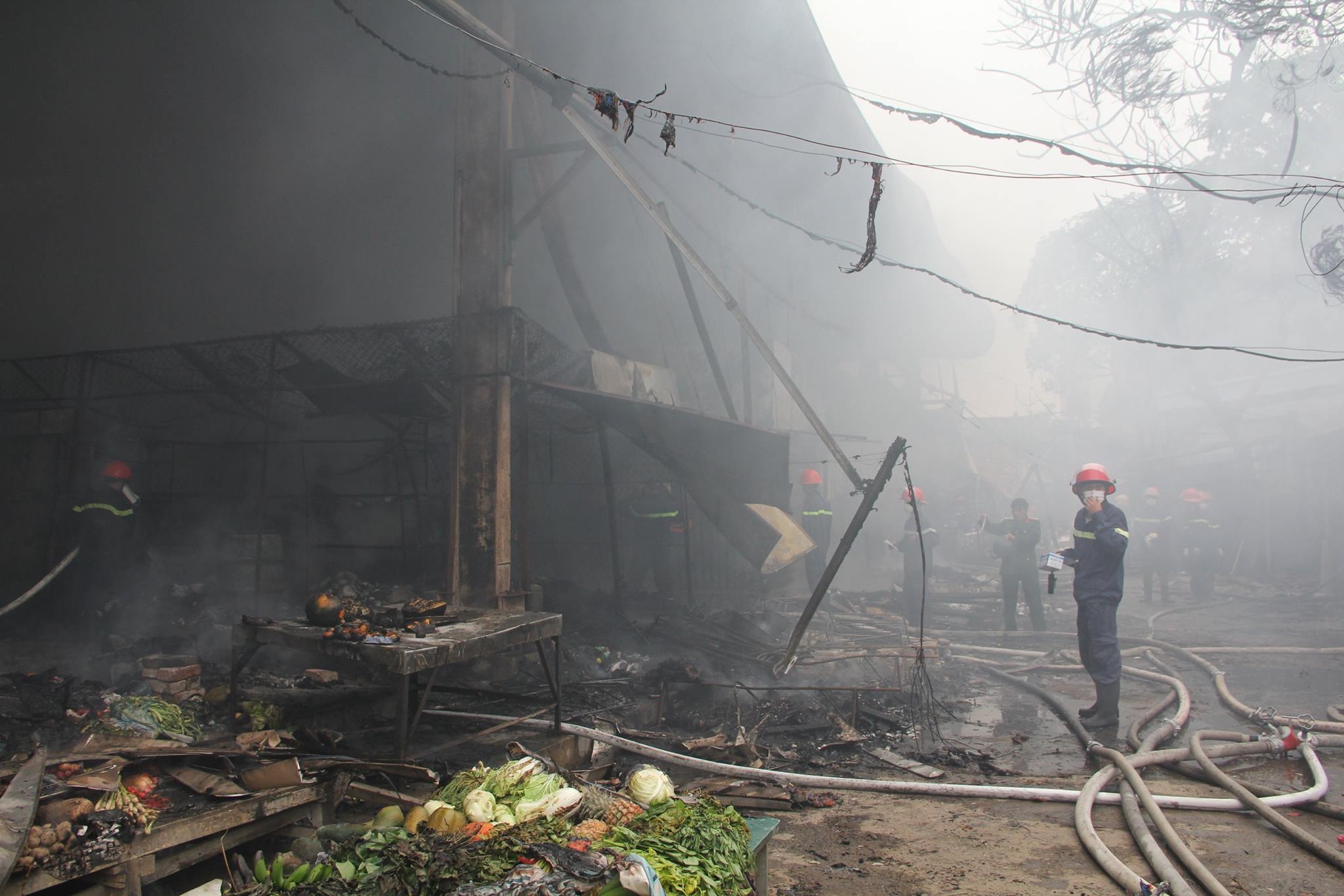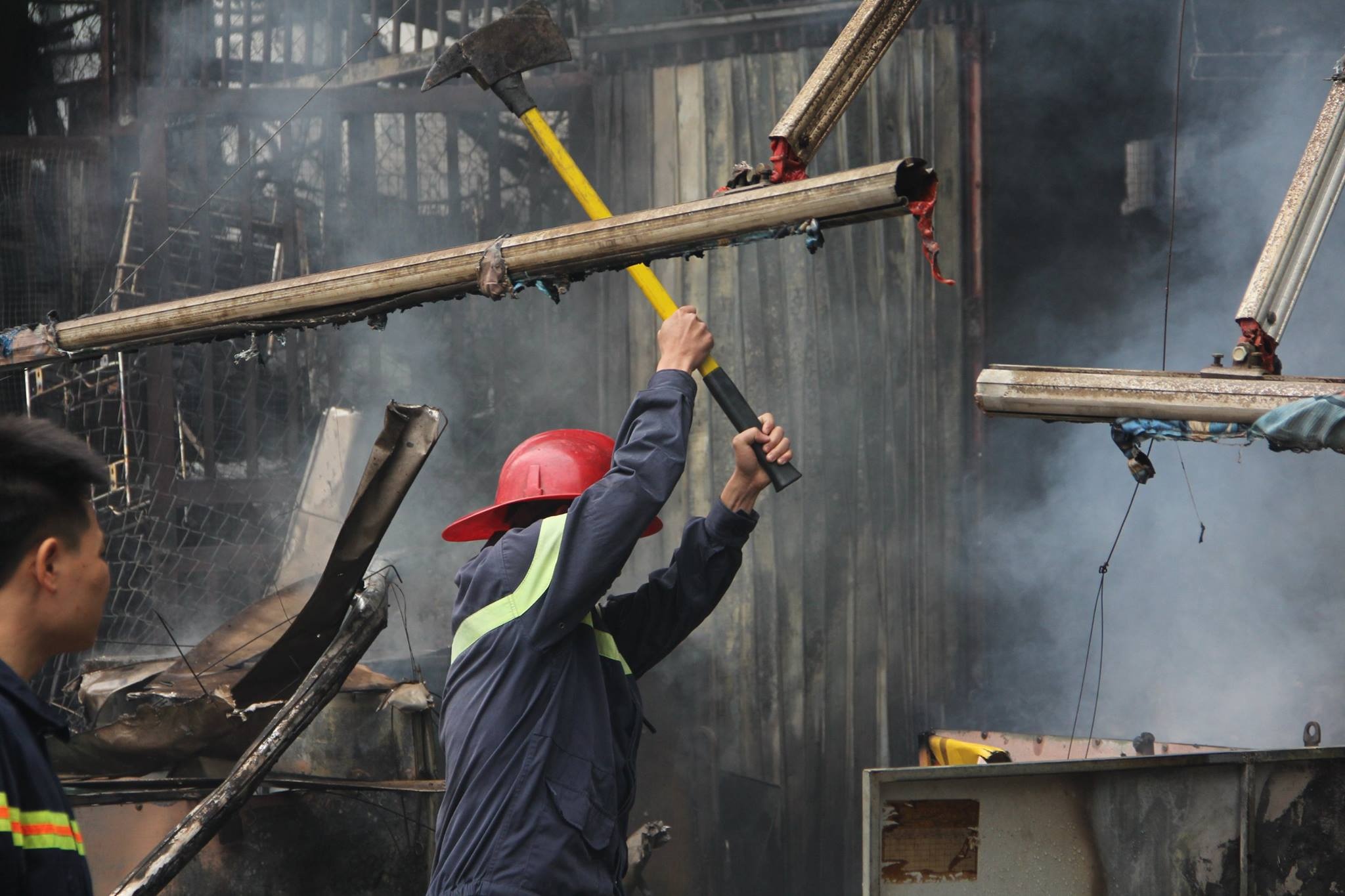 Tuy nhiên, do diện tích rộng, có nhiều vật liệu dễ cháy, lính cứu hỏa tiếp tục phun nước hạ nhiệt khu vực trên.
