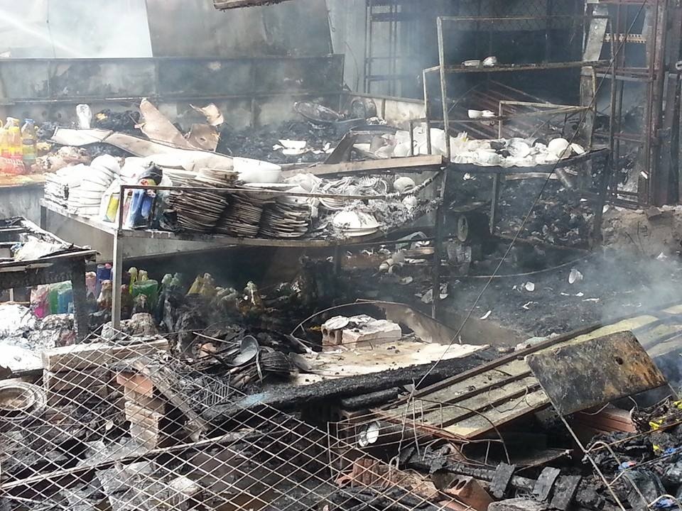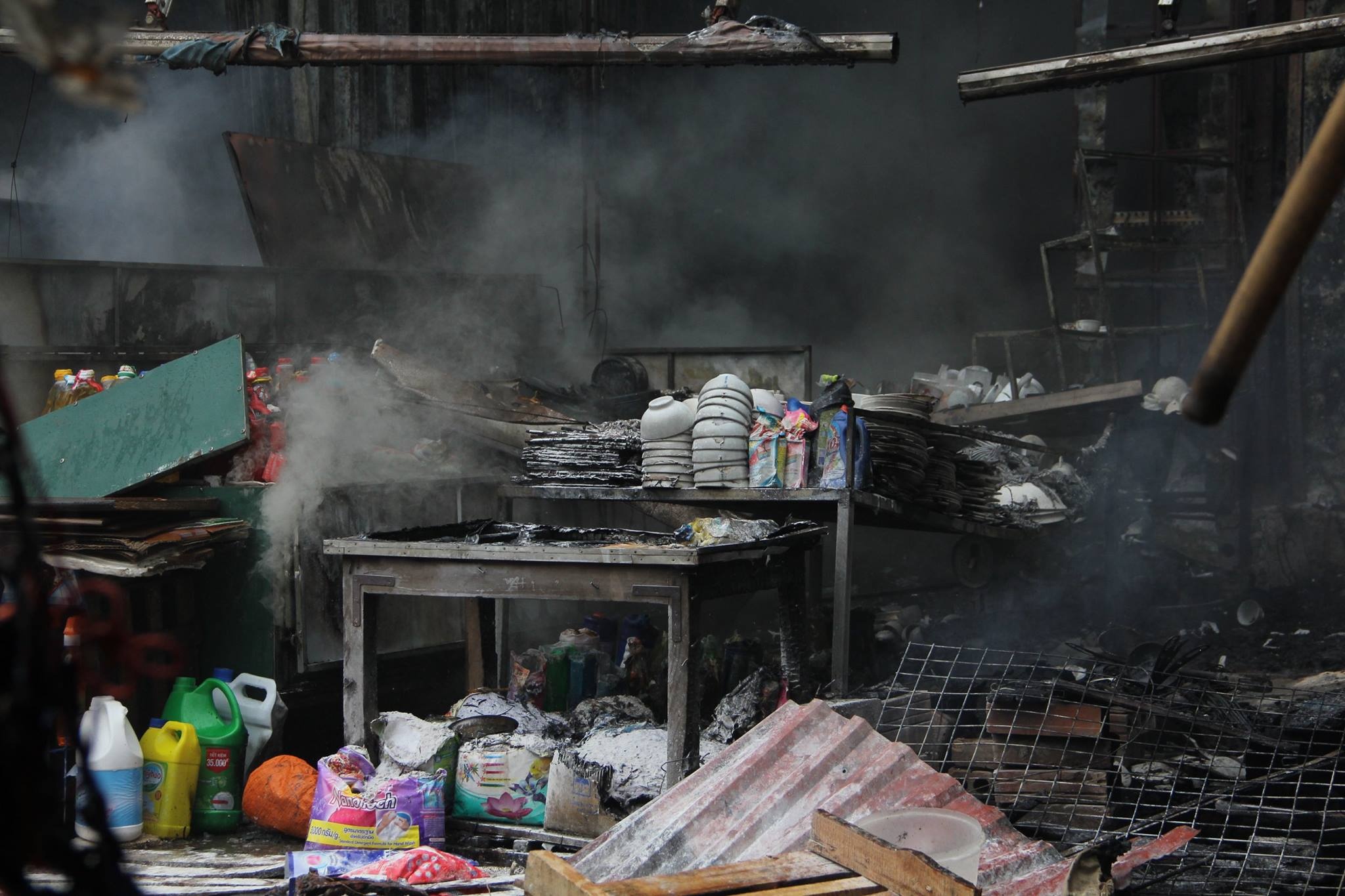 | Lửa bao trùm nhiều gian hàng. Tại khu này các tiểu thương kinh doanh các mặt hàng tiêu dùng từ quần áo, chăn đêm đến thực phẩm... Ước tính, bình quân mỗi cửa hàng có giá trị lên đến hàng trăm triệu đồng. |