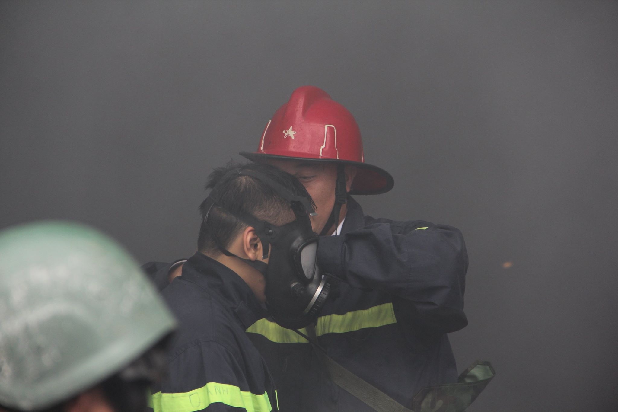 | Để đi sâu vào trong chợ dập lửa, một số cảnh sát chữa cháy phải đeo mặt nạ phòng độc. |