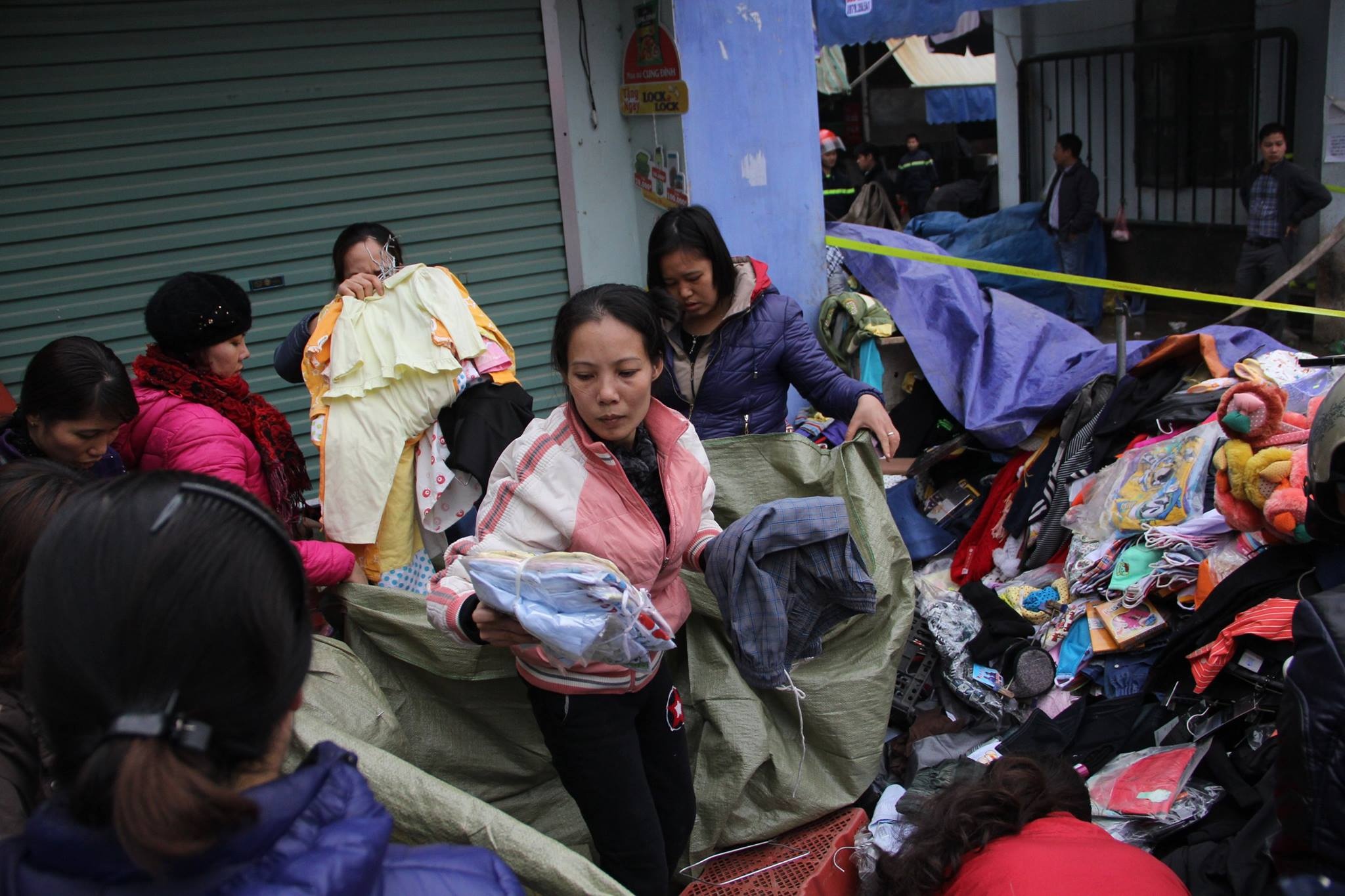 | Một số tiểu thương nhanh chân dọn được hàng hóa ra ngoài cổng chợ... |