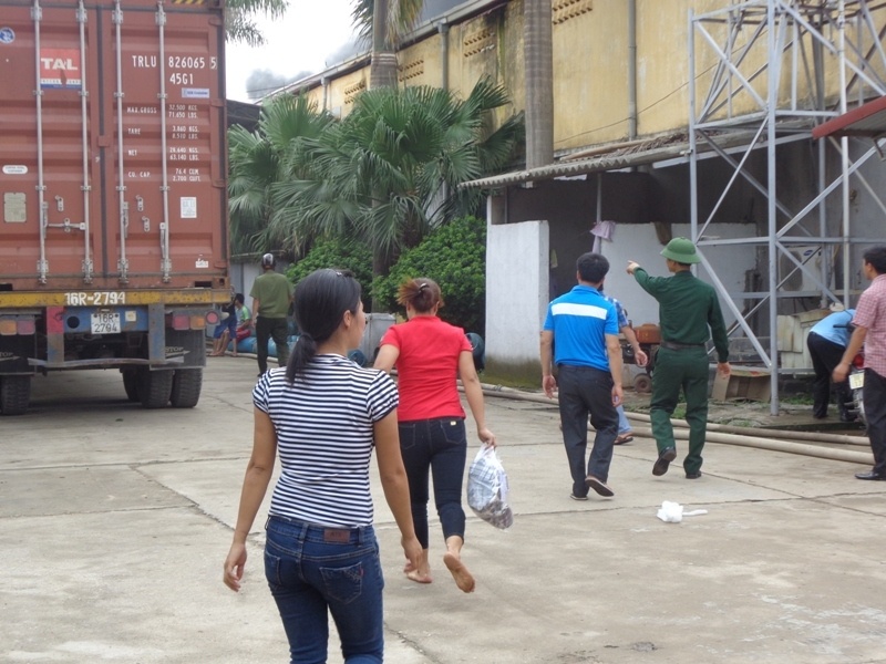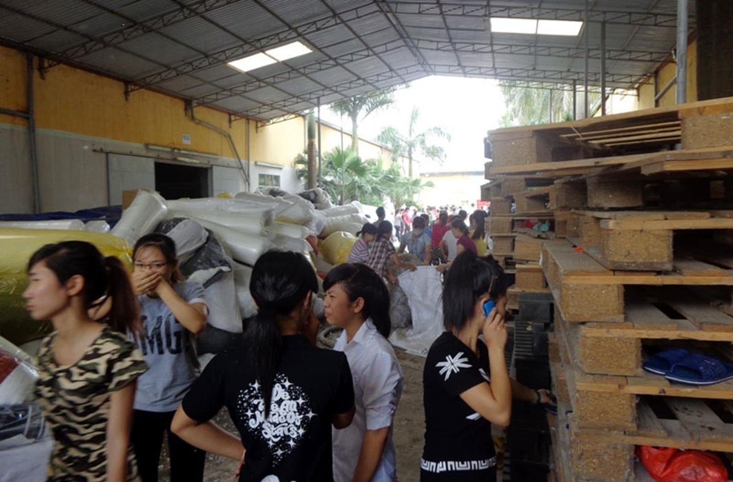 | Chị Cầm, công nhân tạp vụ đang làm ở khu vực của công ty phát hiện ra vụ cháy kể lại: "Ngọn lửa bắt đầu cháy từ lò hơi, sau đó lan sang nhà kho chứa nguyên vật liệu là lông vũ, vải. Tôi chạy ra báo công nhân và bảo vệ. Mọi người chạy tán loạn ra ngoài và báo lực lượng PCCC địa phương". |