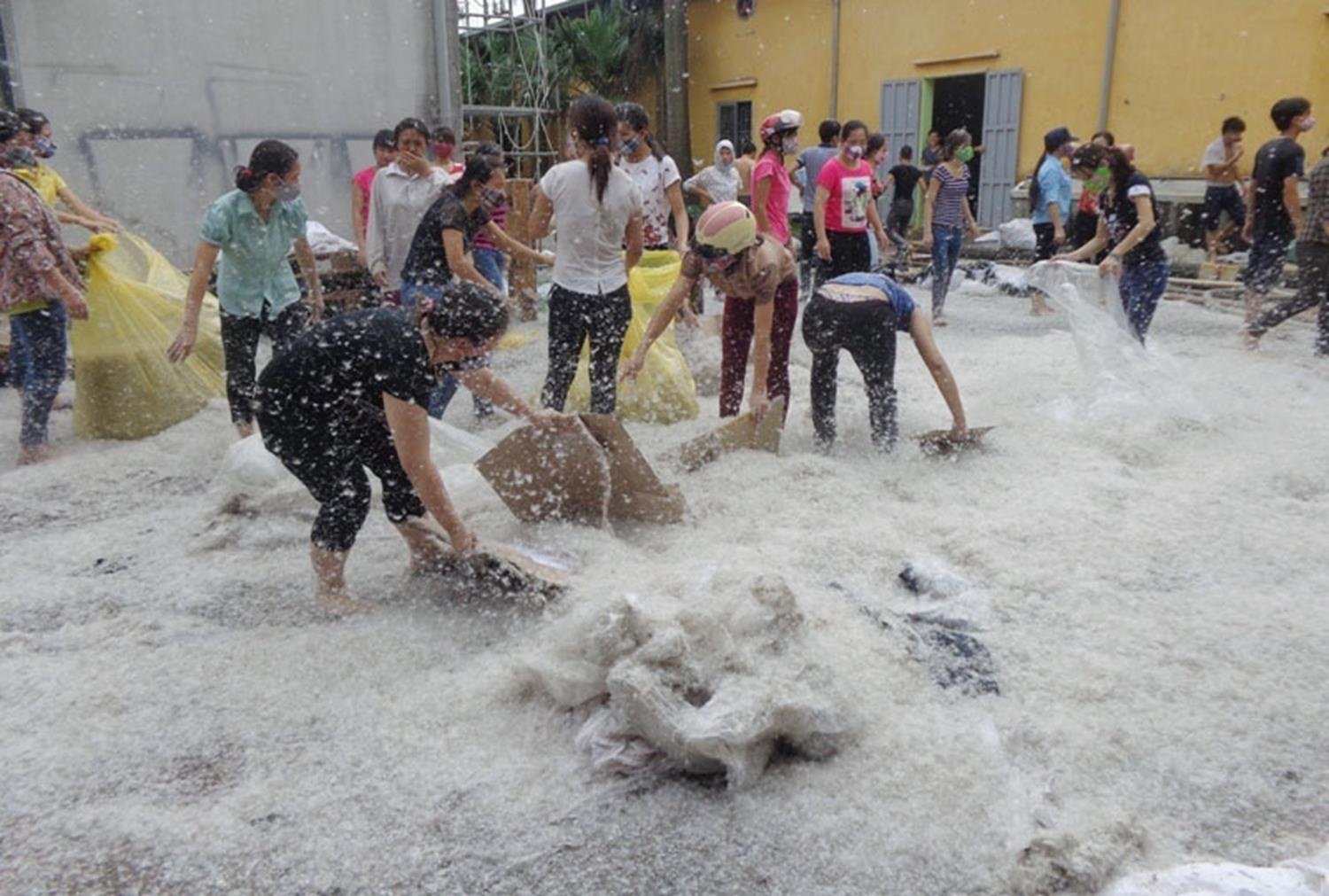 | Bông, lông vũ vung vãi ở trước cửa kho nguyên liệu. |