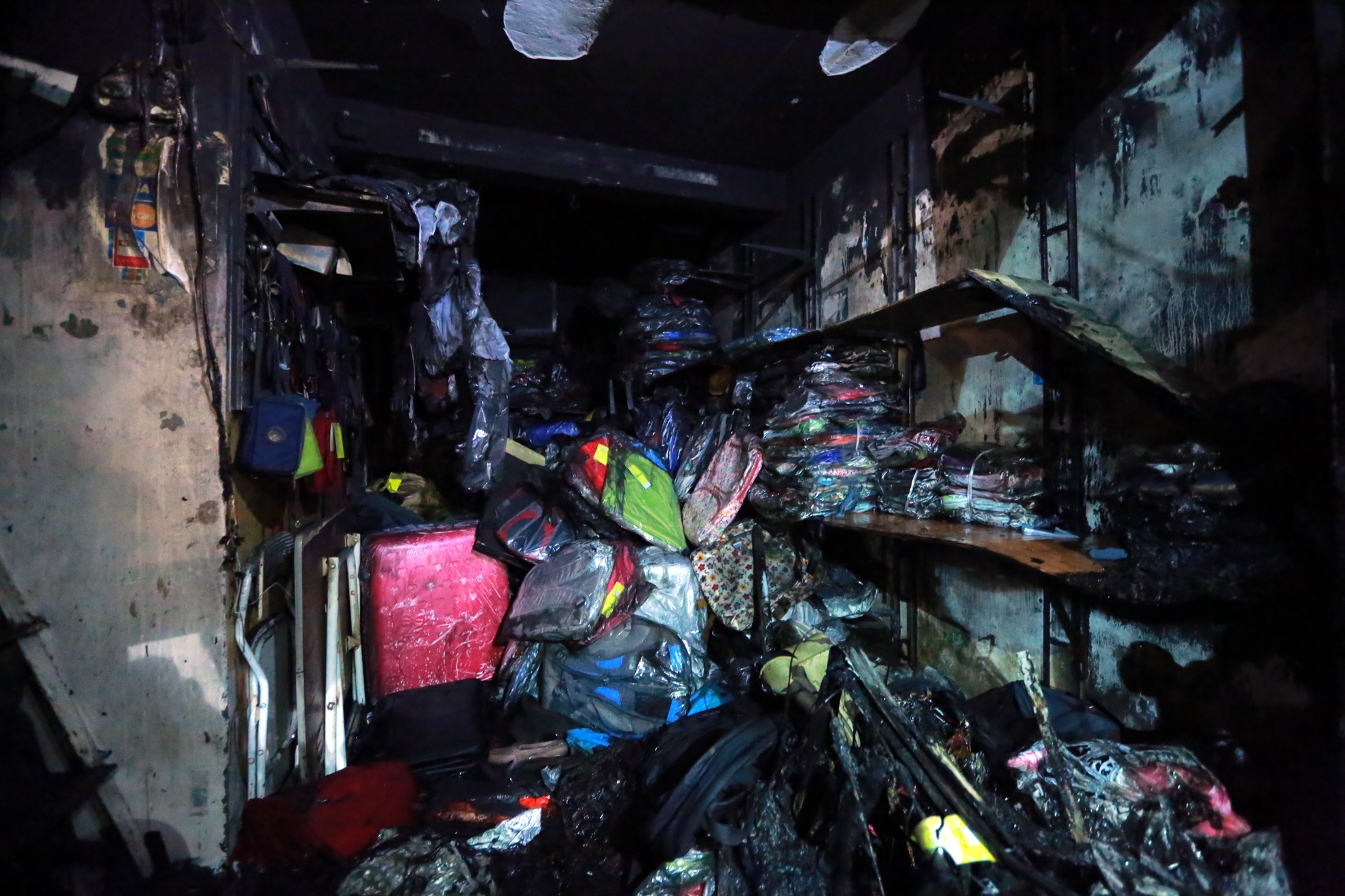 | Căn phòng chứa hàng hóa bị cháy rụi một góc và ngọn lửa ám đen cả trần. |