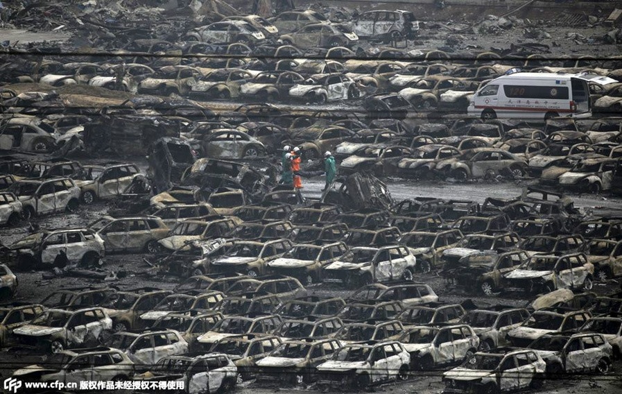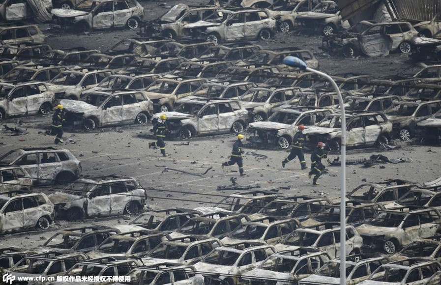 Khoảng 1.000 xe mới cháy rụi do đỗ gần nhà kho. Ảnh: cfp.cn |