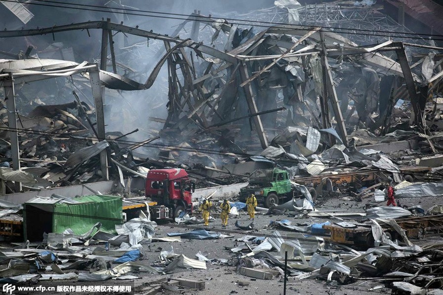 Nhóm cứu hộ đưa thi thể nạn nhân khỏi hiện trường vụ nổ tương đương 24 tấn thuốc nổ TNT. Theo cơ quan dự báo động đất Trung Quốc, các vụ nổ tạo ra địa chấn mạnh tới 2,9 độ Richter. Tính tới thời điểm hiện tại, 55 người thiệt mạng, bao gồm 17 lính cứu hỏa,và hơn 700 người bị thương vì sự cố ở Thiên Tân, China Daily đưa tin. Ảnh: cfp.cn |