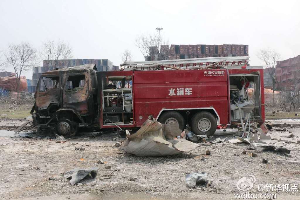 Xe cứu hỏa hỏng vì tác động từ vụ nổ. Ảnh: Weibo |