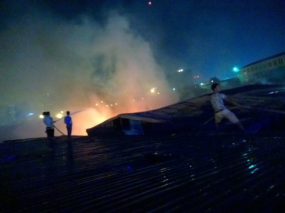 | Người dân cũng liều mình trèo lên nóc các mái tôn xung quanh để chữa cháy. Đã có người thụt chân từ trên nóc nhà xuống và bị thương. |